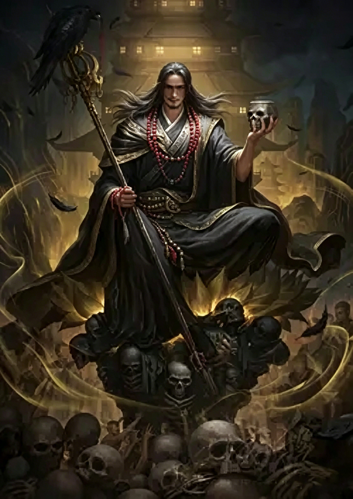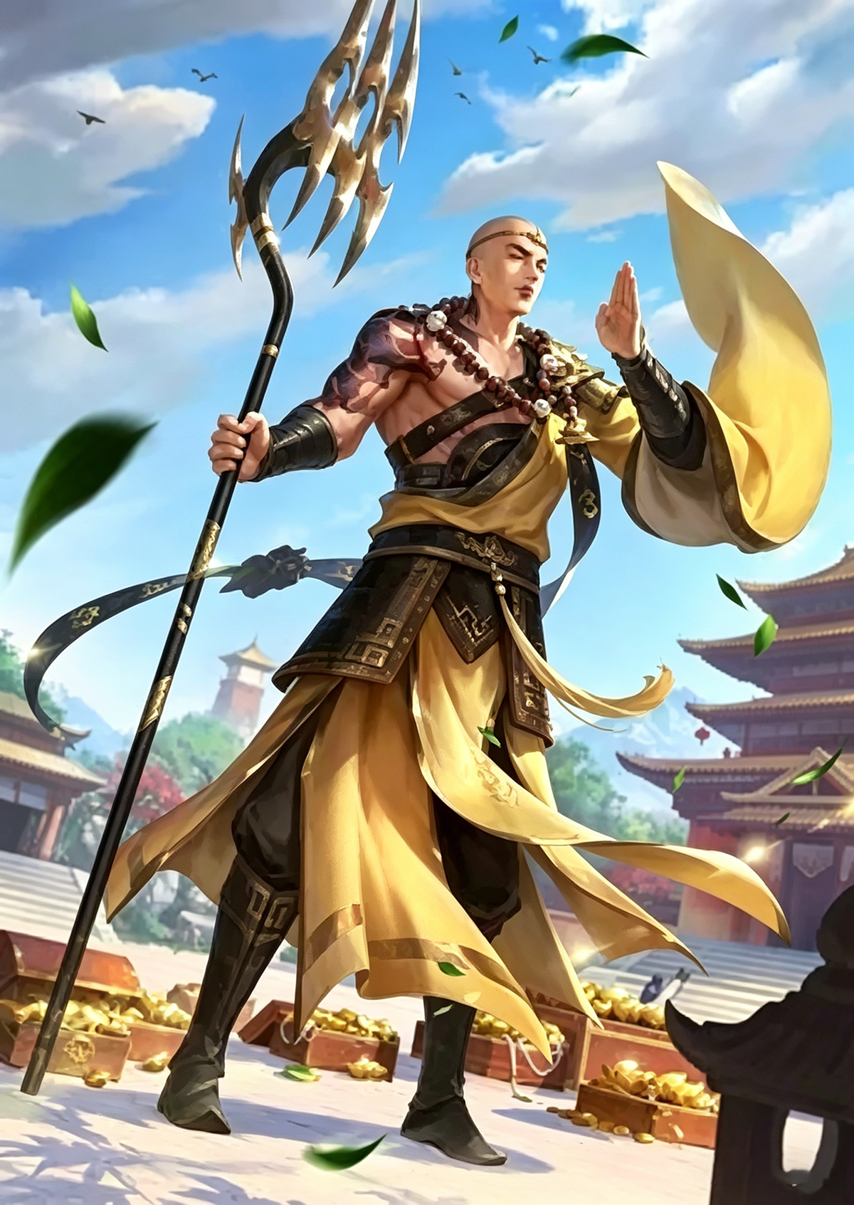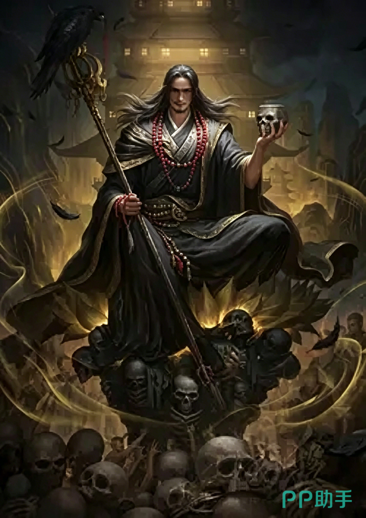笮融共拥有四项技能,其中“浮图”为前置核心机制,承担资源积累与伤害过滤双重职能。该技能依据单回合内“造成伤害最多”或“回复体力最多”两种情形,分别于牌堆顶置入黑色或红色“业”牌;当角色受到伤害时,可弃置一张“业”牌完全抵消此次伤害。“劫辨”为出牌阶段结束时的响应型拼点技能,仅在本回合无角色受伤的前提下触发,可选择与当前回合角色或体力值最低者比点,达成干扰节奏、限制关键操作的目的。限定技“净土”为觉醒节点,发动时须三选一执行:“黑业爆发”(对一名角色造成等同于其手牌数的火焰伤害)、“红业抬血”(令一名角色回复等同于其已损失体力值的体力)或“背水”(弃置所有“业”牌并摸三张牌),发动后失去“浮图”,获得觉醒技“佛宗”。觉醒技“佛宗”可令笮融每使用一张“业”牌,便对一名其他角色造成1点火焰伤害,或令一名己方角色回复1点体力,实现伤害转化与资源再分配。