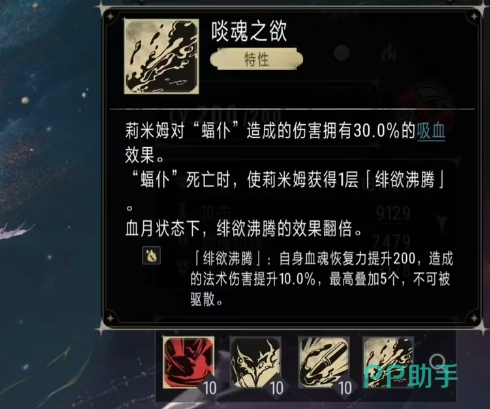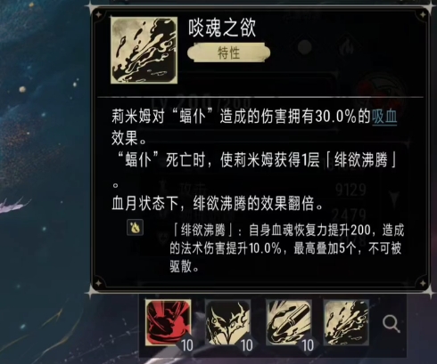 除了基本攻击莉米姆的自身特性也极为突出,当血仆死亡时,会产生一种特殊的能量传递效果,血仆所剩余的能量并不会消散,而是传递给莉米姆,使她获得一层浴血沸腾效果,这种效果最多可叠加到三层,为莉米姆带来了持续的属性提升,每层浴血沸腾效果都能够为莉米姆提升15%的攻速和15%的法术伤害,随着战斗的进行,当成功叠加三层之后,莉米姆的攻速和法术伤害属性都有提升,这不仅使她能够更快地释放技能,还能让每一次的攻击都携带更为强大的法术伤害。