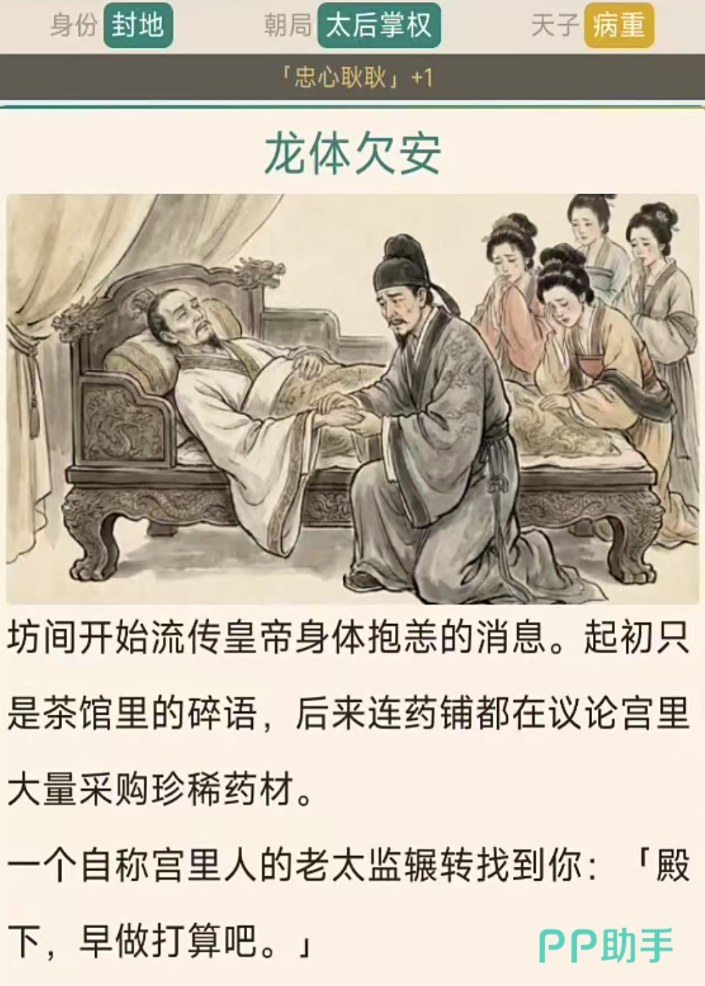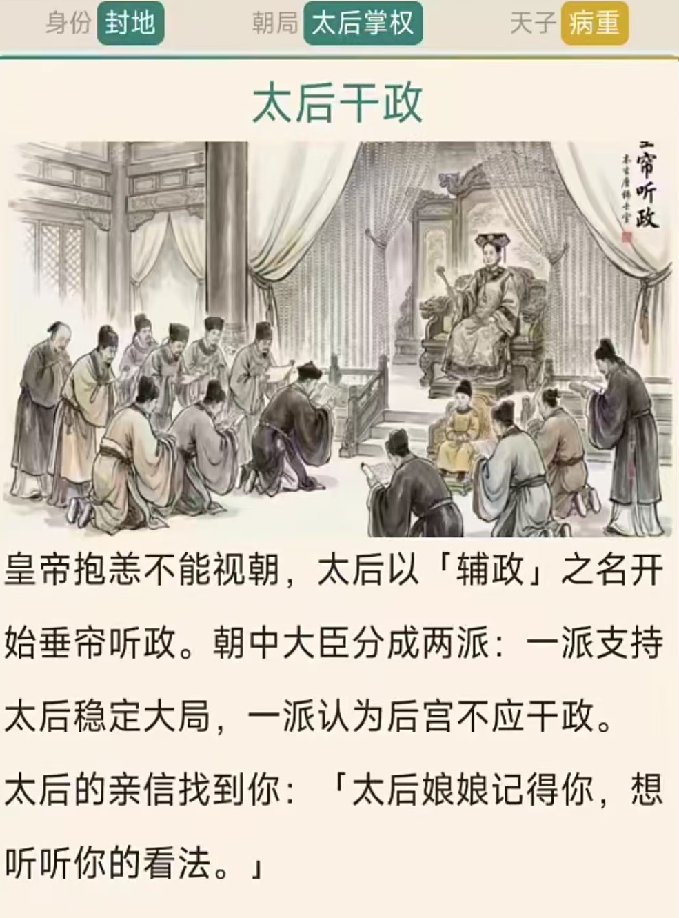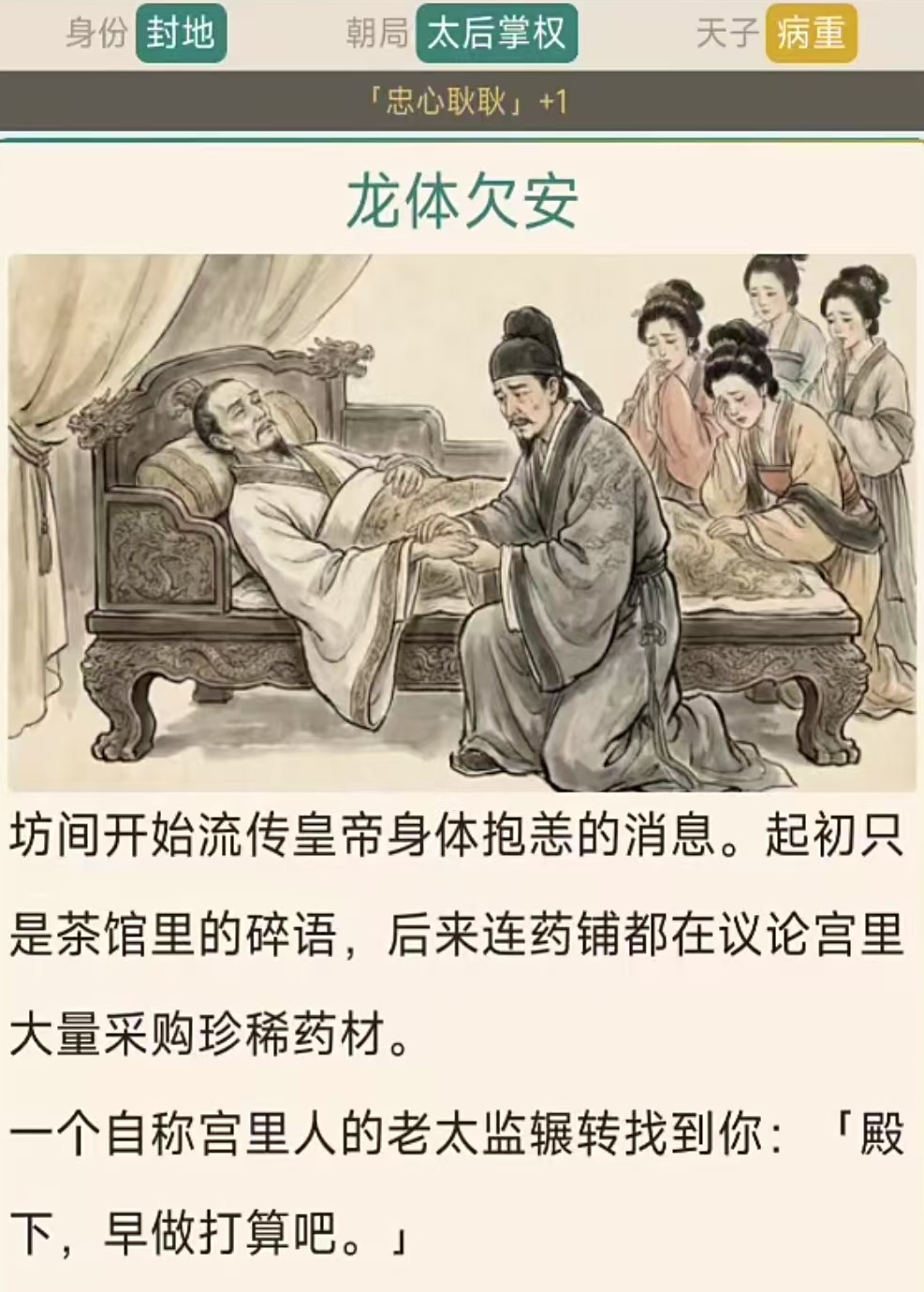 开局即设问:若你本无心帝位,却被推至权力巅峰,该如何自处?每一次朝议发言、每一封奏章批复、每一回人事任免,都牵动全局走向。游戏通过精炼的文字配合情境插画推进流程,选项看似简洁,实则暗含多重逻辑链——短期利益可能埋下长期隐患,仁政之举或致财政崩坏,放权于臣或将引发权臣篡势。唯有反复探索、验证因果,方能逐步拼凑完整的历史图谱。