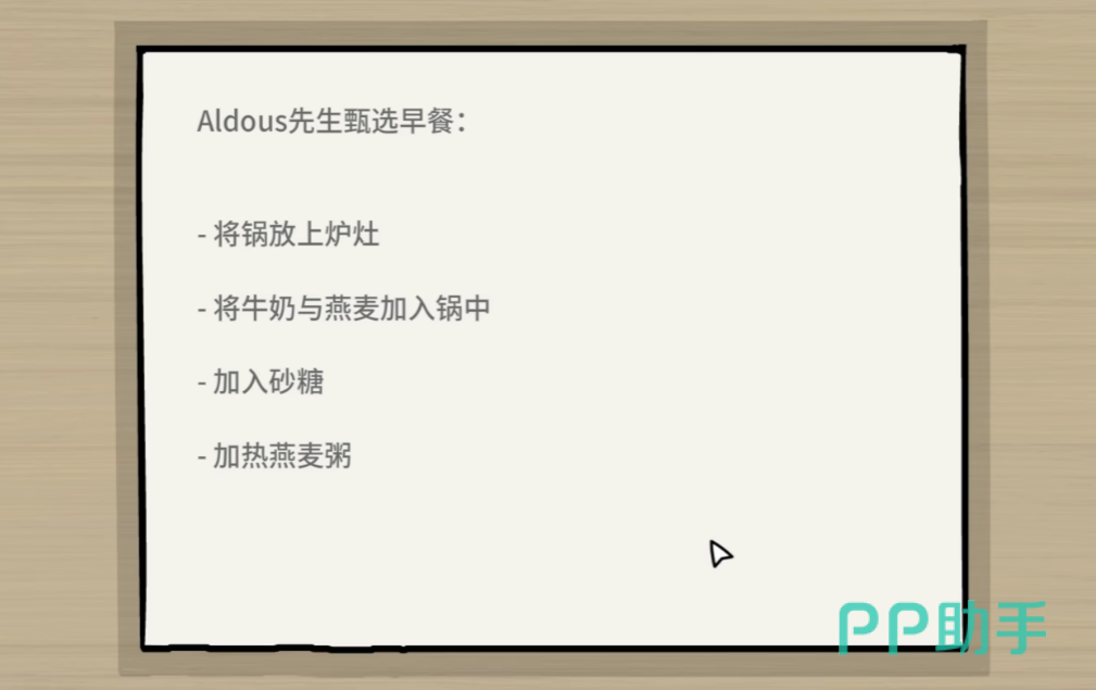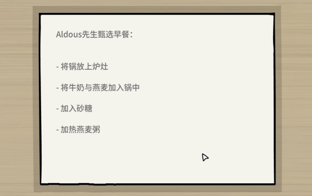 宅邸内部的任务更加复杂且富有仪式感。其中包括准备早餐、唤醒主人、使用剃须刀为其清理胡须、执行晨间例行程序等。在厨房准备早餐时,需打开柜子并输入密码235,取出锅具后依次加入牛奶、燕麦和砂糖,熬煮完成后方可继续下一步。