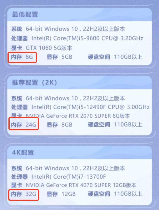 若问题聚焦于运行内存(RAM),则需结合设备类型、目标画质与渲染技术综合判断。以PC平台为例:基础流畅运行需8GB系统内存;开启2K分辨率下建议配备24GB;若追求4K极致画质,则推荐32GB及以上;如额外启用光线追踪(Ray Tracing)与DLSS技术,内存压力将进一步提升,建议同步增强显存与CPU性能支撑。