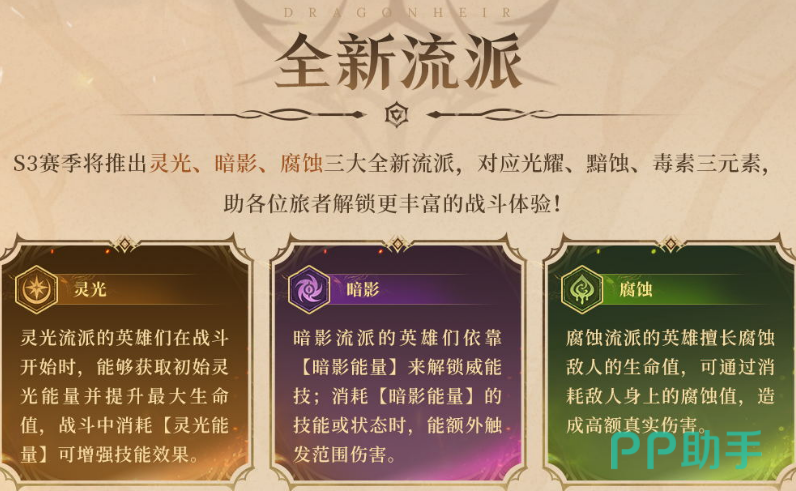 随着全新流派的发布,S3赛季还将引入多位新英雄,给我们带来前所未有的战力提升。从灵光到暗影,再到腐蚀,每个英雄都有独特的技能和属性,配合各自流派的特性,战斗中的每个决策都可能决定胜负。