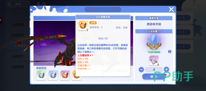 成功击败魔龙后,系统将根据每位参战成员在副本中的实际贡献值(以公会点数形式累计)发放对应品质的“猎魔宝箱”。该奖励仅限参与副本的公会成员获取,非公会人员或未进入战斗流程的玩家无法获得。贡献值越高,所获宝箱品质越优,掉落内容包括钻石、背饰、王国图腾及大量经验值等关键成长资源。这些资源直接关联角色技能升级、战力突破与长期养成进度,是中后期角色构建的重要支撑。