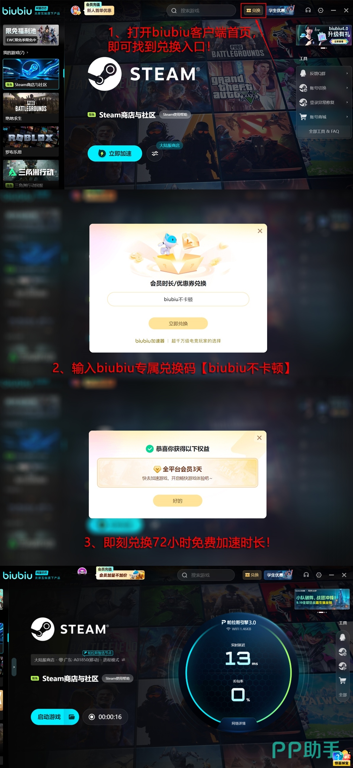 现在加入biubiu用户行列,立即享受专属福利新注册用户可免费领取24小时加速服务,所有玩家无论新老,输入兑换码【biubiu不卡顿】即可额外获得72小时加速时长。一次使用即感受高效稳定的网络体验,轻松畅玩如龙:极3。