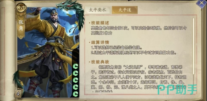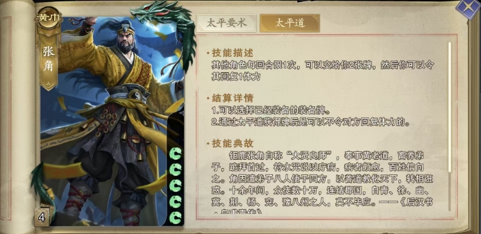 太平道,作为张角在代号杀中的标志性技能之一这个技能允许其他角色每回合限一次,向张角交出2张牌作为入伙费,以此换来1点体力的回复,这种设计也为其在战场上提供了宝贵的支援与恢复能力,更为重要的是通过太平道获得的牌后,张角完全可以选择不令对方回复体力,然而太平道技能的触发条件是比较有难度的。