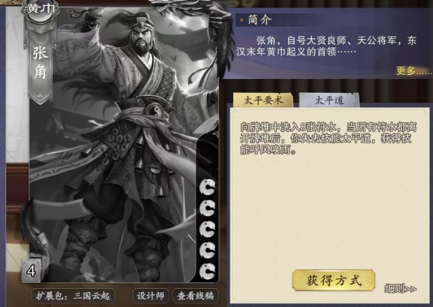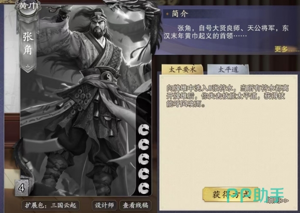 他的太平要术是第一个技能,太平要术的核心机制,在于向牌堆中巧妙地洗入8张符水,这些符水并非寻常之物,它们带有治愈力量,当张角发动此技能时,所有的符水便会悄然融入牌堆,而一旦这些符水因各种缘由离开了牌堆,张角便将失去太平道技能,符水的效果极为独特,当它们被某个幸运的角色获得时,会立即自动打出并消失。