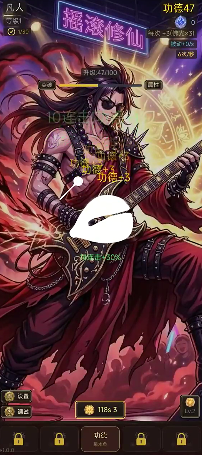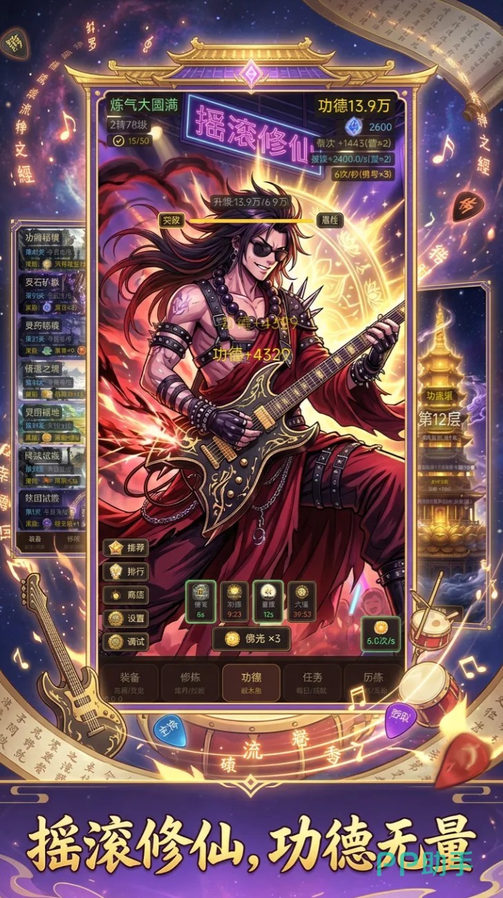 游戏核心机制围绕“功德积累”展开,操作极为直观:玩家仅需轻触屏幕敲击木鱼,即可实时提升功德值。所获功德既可用于净化角色体内煞气,亦能持续强化等级与修为体系。值得一提的是,游戏配乐融合现代摇滚元素,节奏感鲜明,使敲击过程兼具解压性与韵律感,适合碎片化休闲场景。