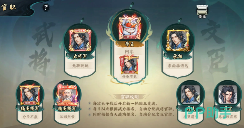 游戏内官职体系分为两大类:文臣与武将。每晚24点系统自动结算并分配职位,完全依据玩家当日表现进行排名。武将官职由战斗力决定,文臣则根据当天积累的战功数量来评定。无论你是偏重战斗输出还是专注资源运营,都能找到适合自己的晋升路线。达到高级别官职后,如大将军或辅国将军,可每日领取大量元宝,且官职等级越高,元宝奖励越丰厚。而丞相、司空、司徒等文臣高位不仅拥有独特荣誉标识,还能享受额外战功加成,进一步提升竞争力。