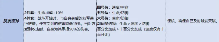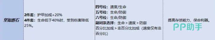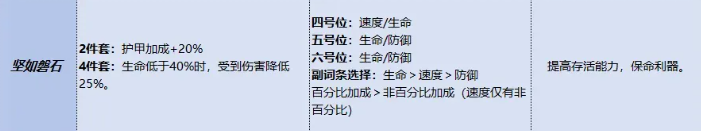 “坚如磐石”则聚焦极限生存场景。两件套提供20%护甲加成;四件套激活“危境减伤”机制——当郭嘉生命值低于40%时,所受伤害降低25%。该效果直接强化其残血续战能力,是应对爆发流阵容的关键屏障。在副词条搭配上,生命与速度属性的价值明显高于基础防御,以兼顾生存阈值与技能释放节奏。