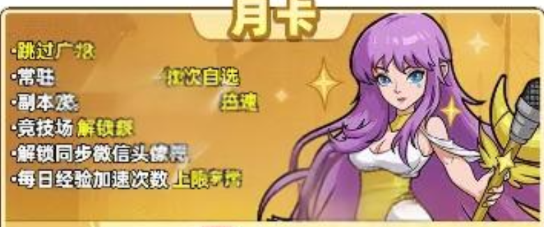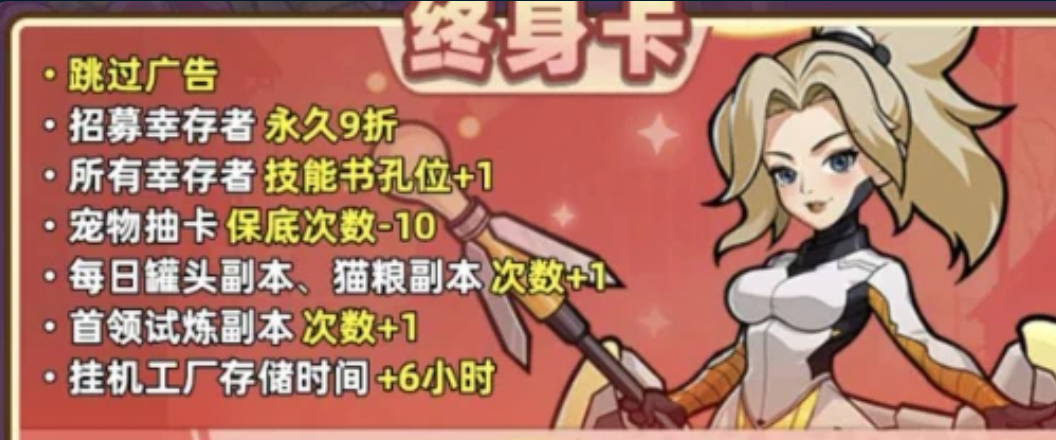 面向高活跃度及高付费意愿用户,游戏构建了分层订阅体系:周卡侧重提升挂机收益上限与离线资源产出效率;月卡提供每日经验加成与战斗加速效果,显著缩短主线任务完成周期;终身卡则在前述功能基础上,额外涵盖广告屏蔽、稀有角色购置折扣、技能学习槽位扩容等深度权益,适配长期运营需求。