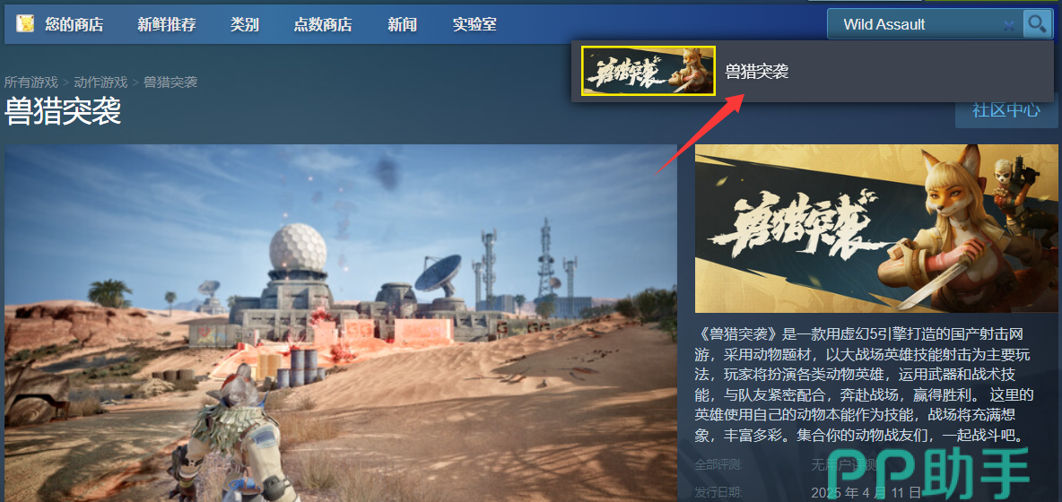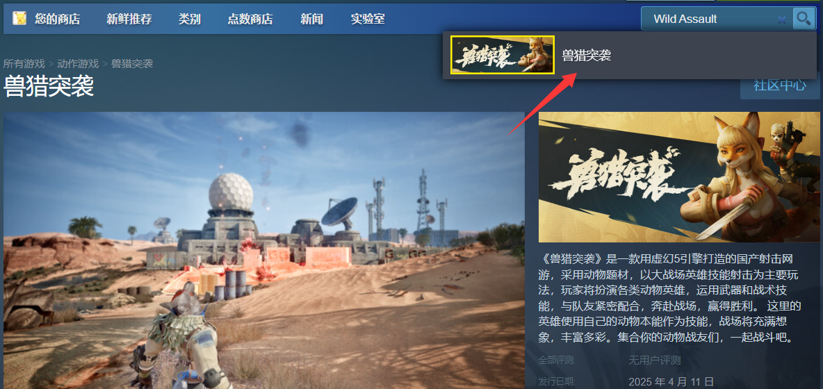 《兽猎突袭》的英文名叫做《Wild Assault》,无论是中文名还是英文名,在steam国区上都可以通过搜索找到它。但是如果输入搜索框中不能显示该游戏的预览,就说明是网速太差了,需要使用工具提速才行,不然搜索页面可能都打不开,更不要说还要在游戏里多人对战了。