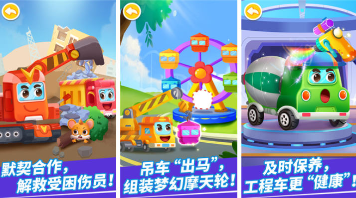 本作也是适合亲子互动的工程车启蒙类游戏,你将在游戏的帮助下了解工程车的工作状态,还能体验到工程车的保养、升级类的玩法,各个工程车可以默契合作完成一些超难任务,吊车、卡车等超大的工程车提高了认知度,卡通萌版画面与萌系工程车造型更具观赏性,充满奇思妙想的互动体验也是孩子的最爱。