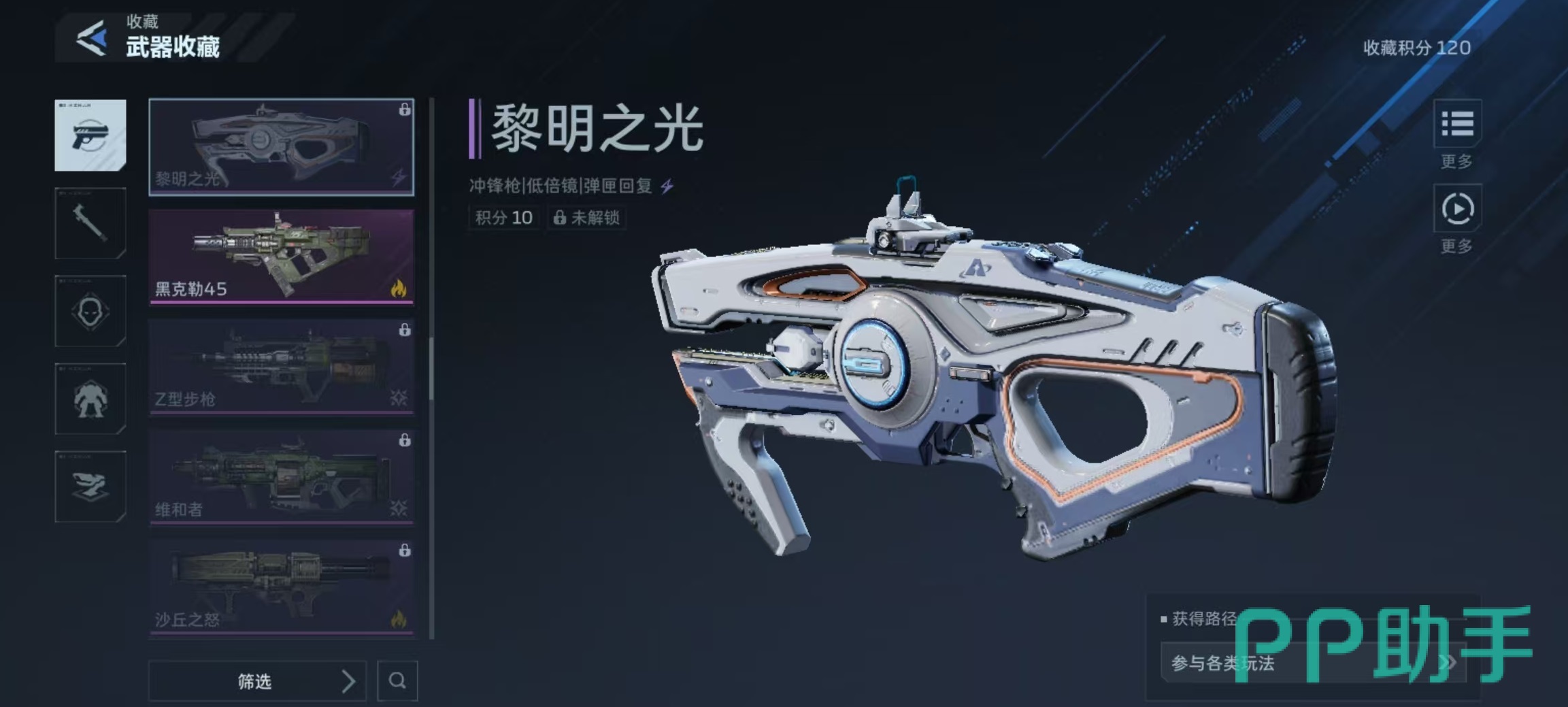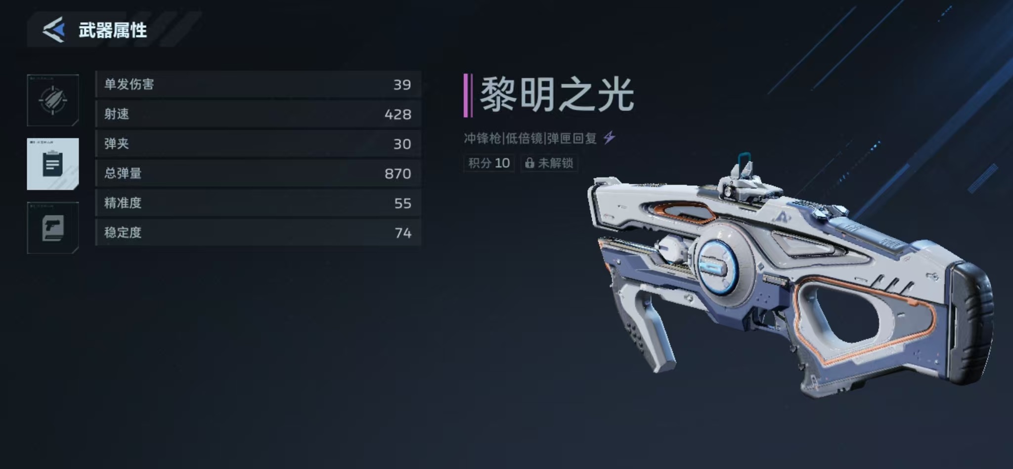 “黎明之光”归类为冲锋枪,基础属性明确:单发伤害39点,射速428 RPM,弹匣容量30发,总携弹量870发;精准度55,稳定度74。其结构采用无枪托轻量化设计,显著提升连续扫射时的手感稳定性,尤其适合中近距离持续压制。获取途径包括常规玩法掉落、钛金密藏开启等,解锁后即可直接装配使用。