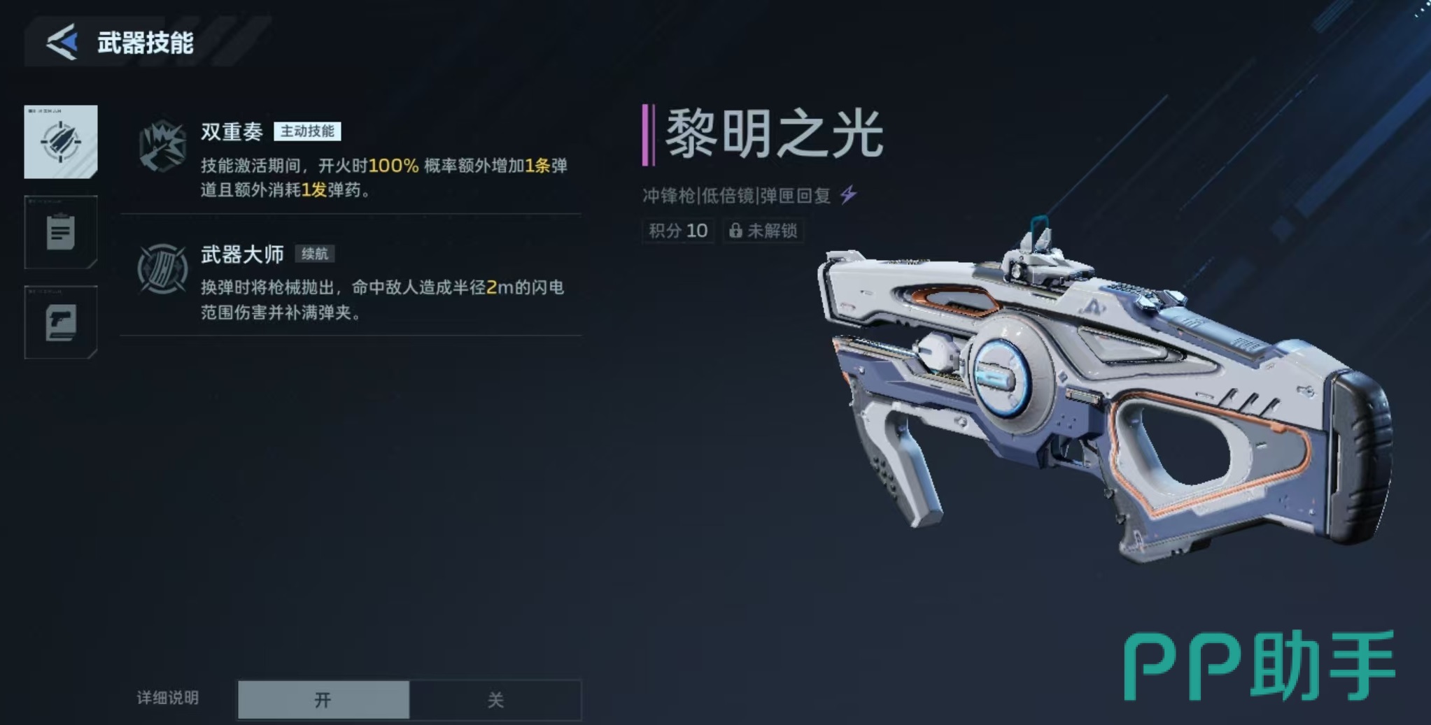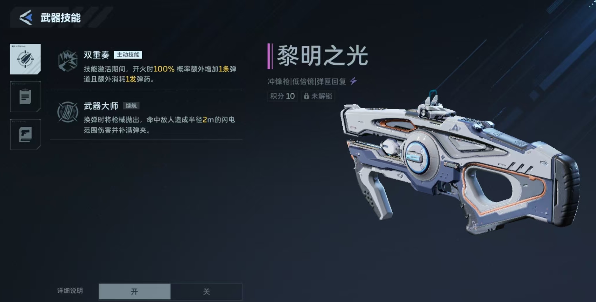 该武器配备两项核心技能——“双重奏”与“武器大师”。其中,“双重奏”为瞬发式主动技能:激活期间每次开火均有100%概率生成第二条独立弹道,额外消耗1发子弹,大幅增强瞬间火力密度;“武器大师”则属于战术续航技能:换弹时自动投掷枪械,命中目标后触发半径2米的闪电范围伤害,并同步补满当前弹匣。两项技能协同作用,使“黎明之光”在节奏把控与持续输出层面具备显著优势。