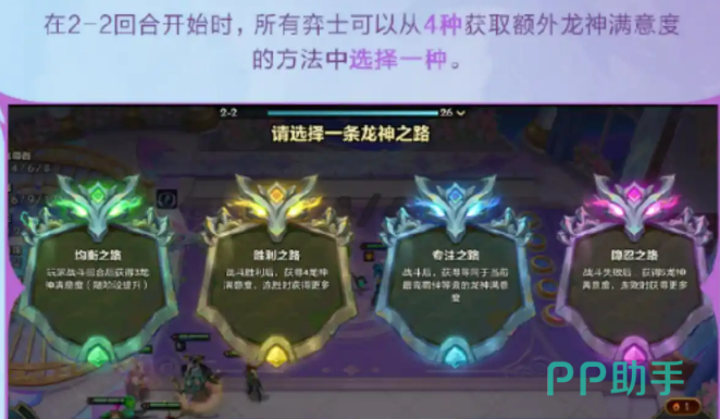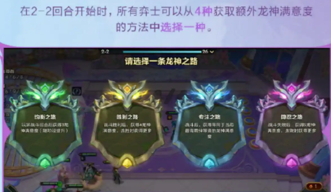 而除了新角色,新机制也成了这次返场的一大亮点。玩家们在2-2阶段的“龙神试炼”中积攒满意度,走上不同的龙神之路,根据不同的需求,选择适合自己的发展路线。每次的满意度积攒都能带来不一样的奖励,而如果你还是个连败玩家,隐忍之路简直是你的专属道路。想要稳定赚金币,选择胜利之路就对了。每个选择,都是一次对策略与运气的考验。