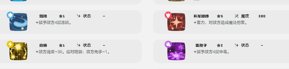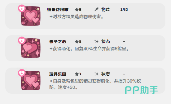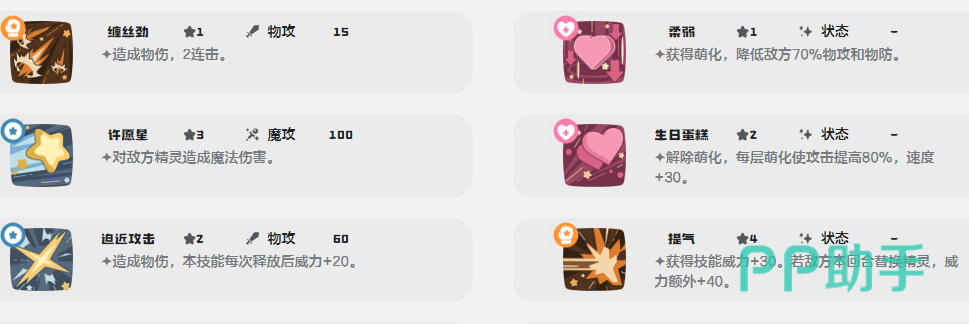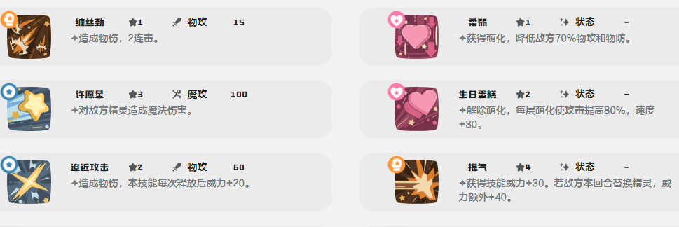 从输出能力来看,超级糖果是其主要物理输出手段,具备高达130威力的物理伤害,并且释放后可立即进入“萌化”状态,提升后续作战效率。触底强击则是一个具有策略性的魔法技能,基础威力为60,当自身能量耗尽时释放,威力额外增加100,适合关键时刻打出爆发伤害。此外,迫近攻击也是一个值得关注的技能,每次使用后技能威力提升20点,连续释放可实现多段增伤,面对高血量目标时尤为有效。