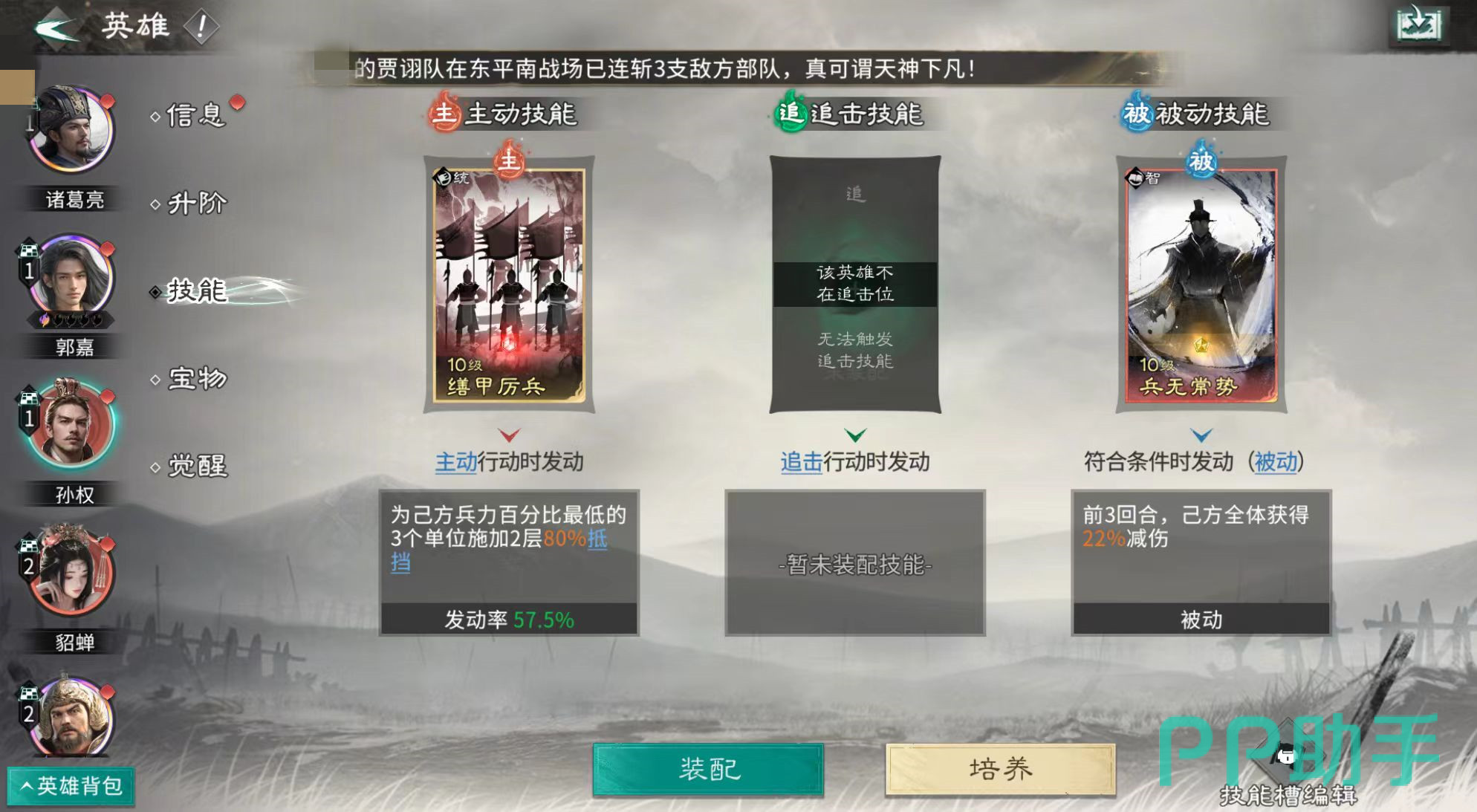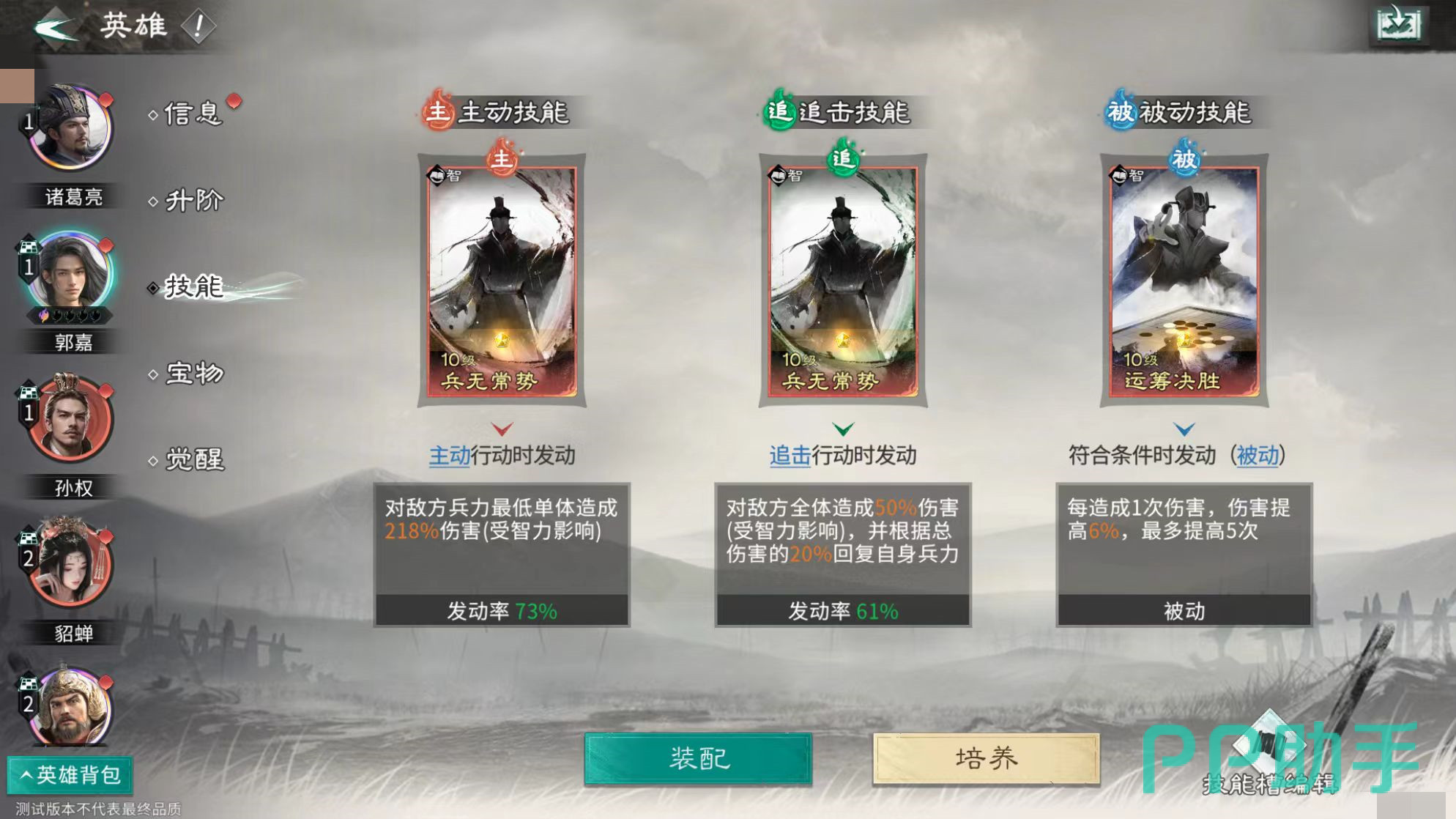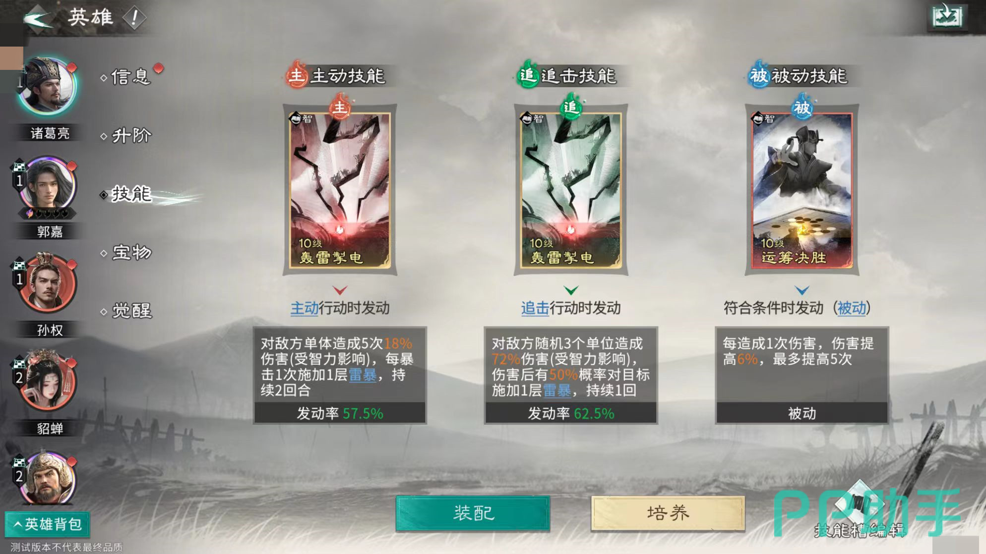 诸葛亮定位为拼点节奏发动机,其被动可在敌方释放技能后立即发动智力比拼并造成伤害,进一步扩大拼点窗口。其自身高智力属性保障比拼胜率,持续激活孙权天赋。技能配置方面:诸葛亮携带轰雷掣电与运筹决胜;郭嘉装配兵无常势与运筹决胜;孙权则选择善甲利兵与兵无常势。整套技能链覆盖控制、爆发、增益与反制,兼顾功能性与实战稳定性。