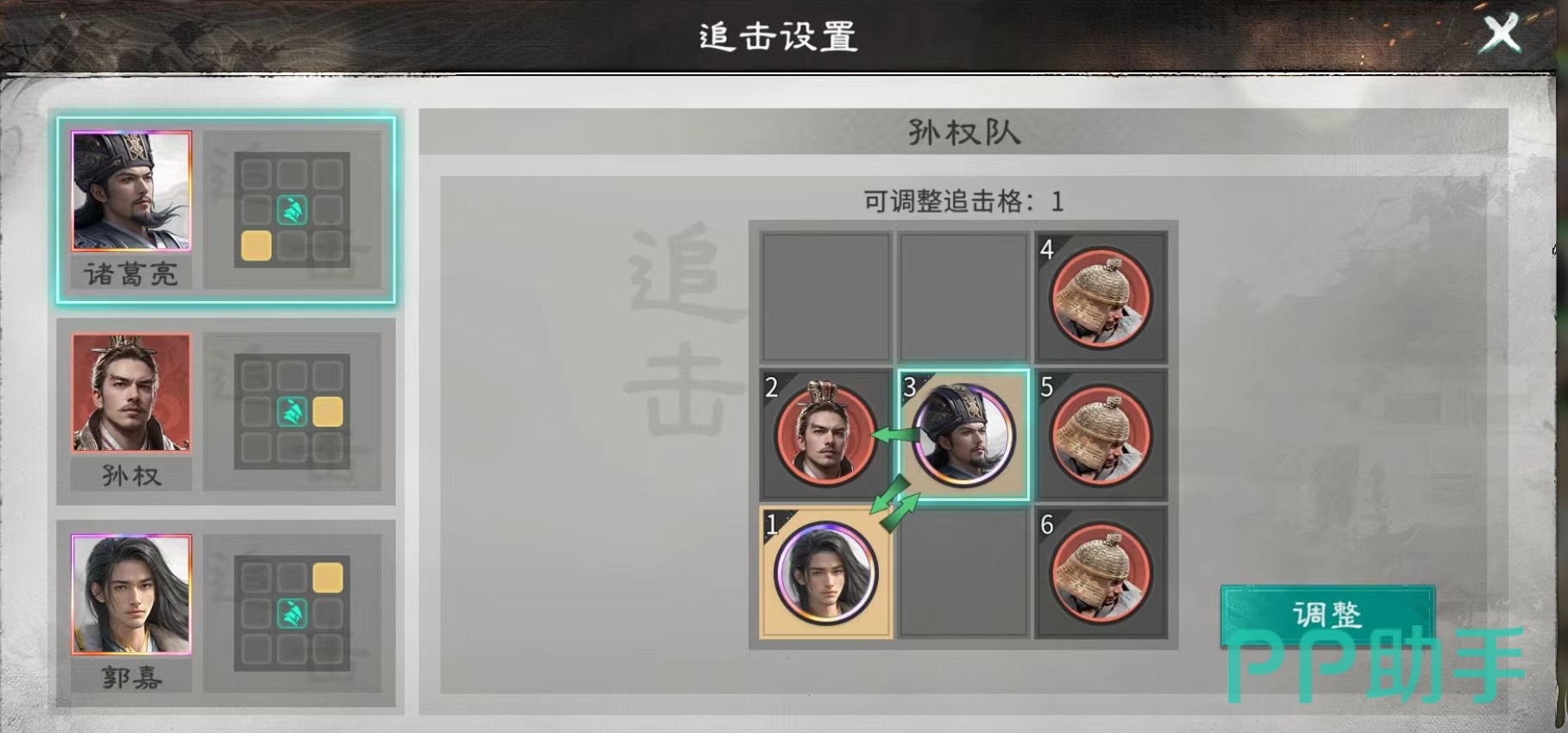 主力武将组合为诸葛亮、孙权、郭嘉,兵种统一选用藤甲兵。前排三格全部部署藤甲兵承担物理伤害,诸葛亮置于孙权与郭嘉的追击范围内,郭嘉位置需确保处于诸葛亮追击格内,孙权则无需刻意调整站位。此布阵逻辑依托孙权天赋——为全体友军提供四维属性加成,并在拼点结果触发对应响应:胜则伤敌,败则疗友。郭嘉凭借全服顶尖的智力成长值,可高频发起与敌方武将的智力比拼,极大提升孙权被动触发频率。