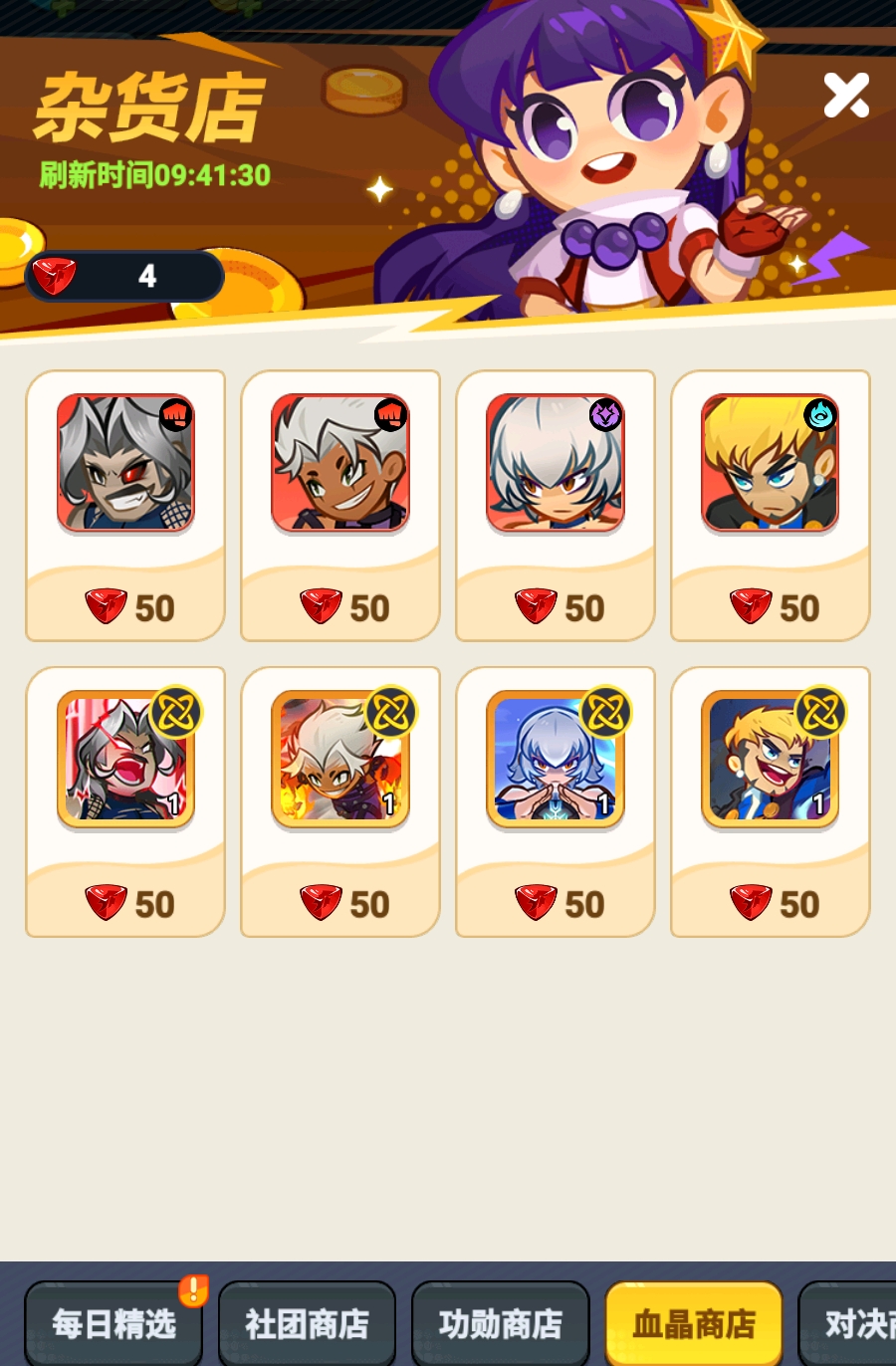 当累计血晶达50枚时,玩家即可前往血晶商店兑换指定SSR格斗家,或为其已拥有的SSR角色兑换专属奥义技能。当前可兑换的SSR格斗家共四位:大蛇、卢卡尔、库利扎里德、高尼茨。从实战适配性出发,推荐优先兑换高尼茨与大蛇。前者低星级即可投入灵契队体系,泛用性强;后者具备高倍率群体伤害能力,是多数主流输出阵容的关键核心。