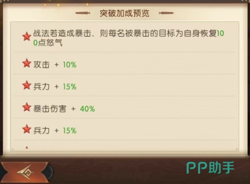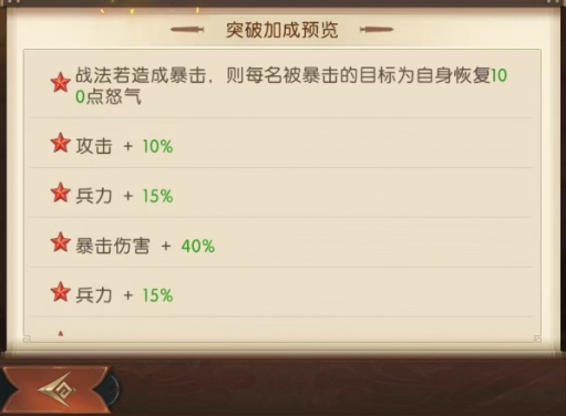 枭姬技能则每次释放战法都能使战法伤害提升15%,最多可叠加 3层,随着战斗的进行,她的输出能力会逐步增强,在战斗的中后期能够发挥出更为恐怖的潜力,孙尚香在突破之后,战法若造成暴击,每名被暴击的目标会为自身恢复100点怒气,这一突破属性进一步提升了她的战斗续航与输出能力,其攻击属性提升 10%,使得她在战场上的普攻与技能伤害都能有增加。