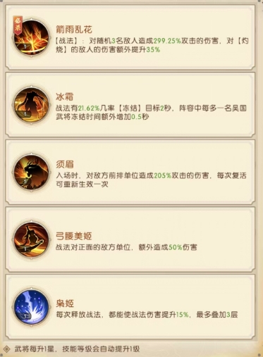须眉技能则是在入场时对敌方前排单位造成 205%攻击的伤害,并且每次复活都可重新生效一次,这一技能让孙尚香在战斗初期就能对敌方前排造成巨大压力,即使在复活后也能再次发挥重要作用,无论是在持久战还是反复争夺的战斗中,都能持续地对敌方前排产生威胁,弓腰美姬战法能够对正面的敌方单位额外造成 50%的伤害,进一步强化了她正面输出的能力,在与敌方正面交锋时,可以迅速削减敌方血量。