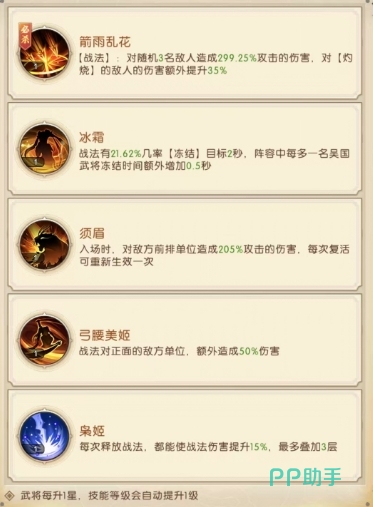 她的大招叫做箭雨乱花,具有强大的群体伤害能力,其战法效果是对随机 3 名敌人造成高达 299.25%攻击的伤害,并且如果目标处于灼烧状态,那么伤害还会额外提升 35%,这一特性使得她在面对有灼烧负面状态的敌人时能够提升输出效率,针对敌方带有灼烧效果的角色,都能发挥作用,冰霜技能的战法有 21.62%的几率冻结目标 2 秒,而且阵容中每多一名吴国武将,冻结时间还会额外增加 0.5 秒,这在团队战斗中能够有效地控制敌方单位的行动,配合队友的技能释放。