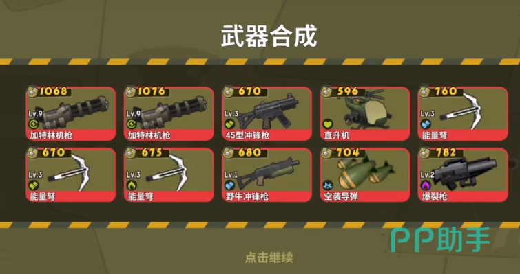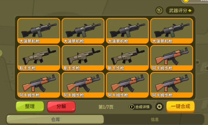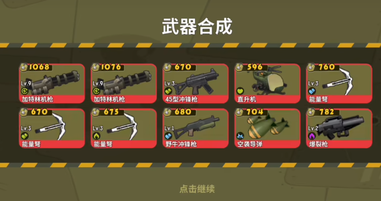 游戏中最具特色的系统是枪械合成机制——不依赖固定配方,而是通过“同等级+同类型”两把武器进行融合升级。合成后新武器等级提升一级,但具体种类完全随机。加特林作为高战力代表武器,基础属性显著优于常规枪械,拥有更强的持续输出能力与压制效果。由于其稀有度较高,建议玩家优先使用高等级武器(如四级或五级)进行多次合成尝试,以提高获取概率。