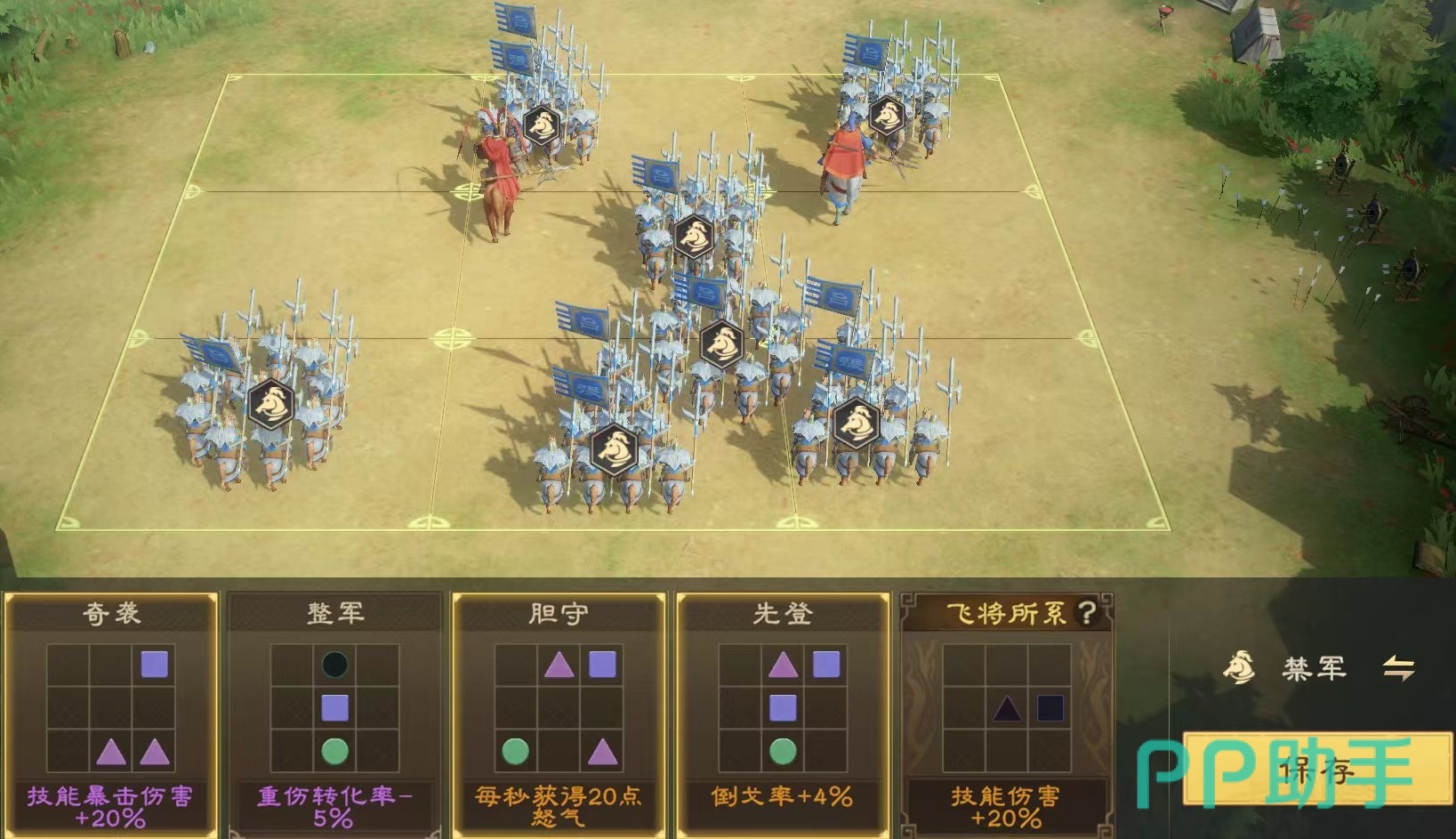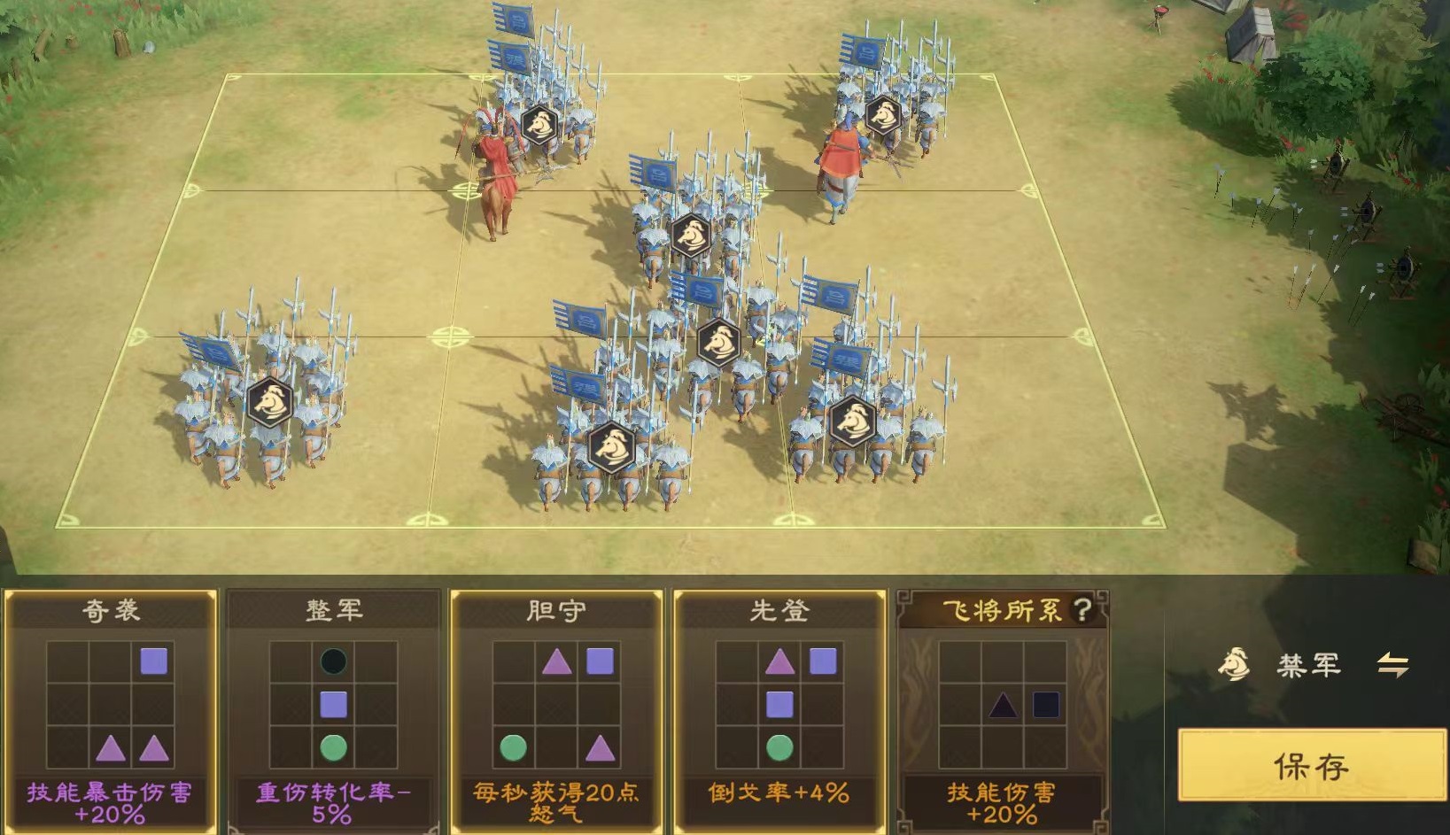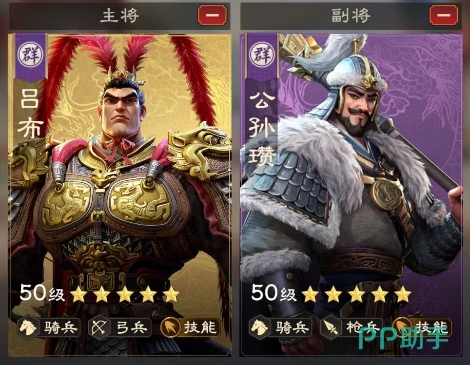 另一套实用阵容为吕布搭配公孙瓒,兵种选用禁军,阵法仍采用双龙阵。尽管公孙瓒为紫色品质武将,但其实战表现不容小觑,其被动可提升全队技能伤害与暴击概率,怒气技同样带有击退效果,能有效衔接吕布的技能节奏。此组合成型门槛低,适合前期快速推进关卡,待后期资源充足后可逐步替换为貂蝉完成阵容升级。