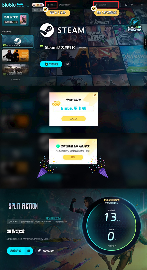 若是玩家希望到时可去解锁更多加速福利,其实到时可考虑来点击兑换,然后借助【biubiu不卡顿】,就能在对应界面来顺利领取到72h的加速时长,助力自己去长时间体验。
