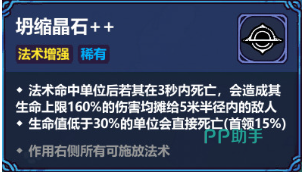 坍缩晶石的作用范围覆盖右侧所有可释放的法术技能,属于全局型增益。当施放的法术命中目标后,若该敌方单位在接下来的三秒内死亡,则会触发额外效果:将其生命上限160%的数值转化为真实伤害,并平均分配给5米范围内的其他敌人。需要注意的是,这种伤害并非传统意义上的爆炸判定,而是精准锁定区域内每一个敌对单位进行分摊结算。虽然单体承受的伤害值可能不算极高,但在面对成群小怪时,配合斩杀机制能够实现高效的连锁清除。