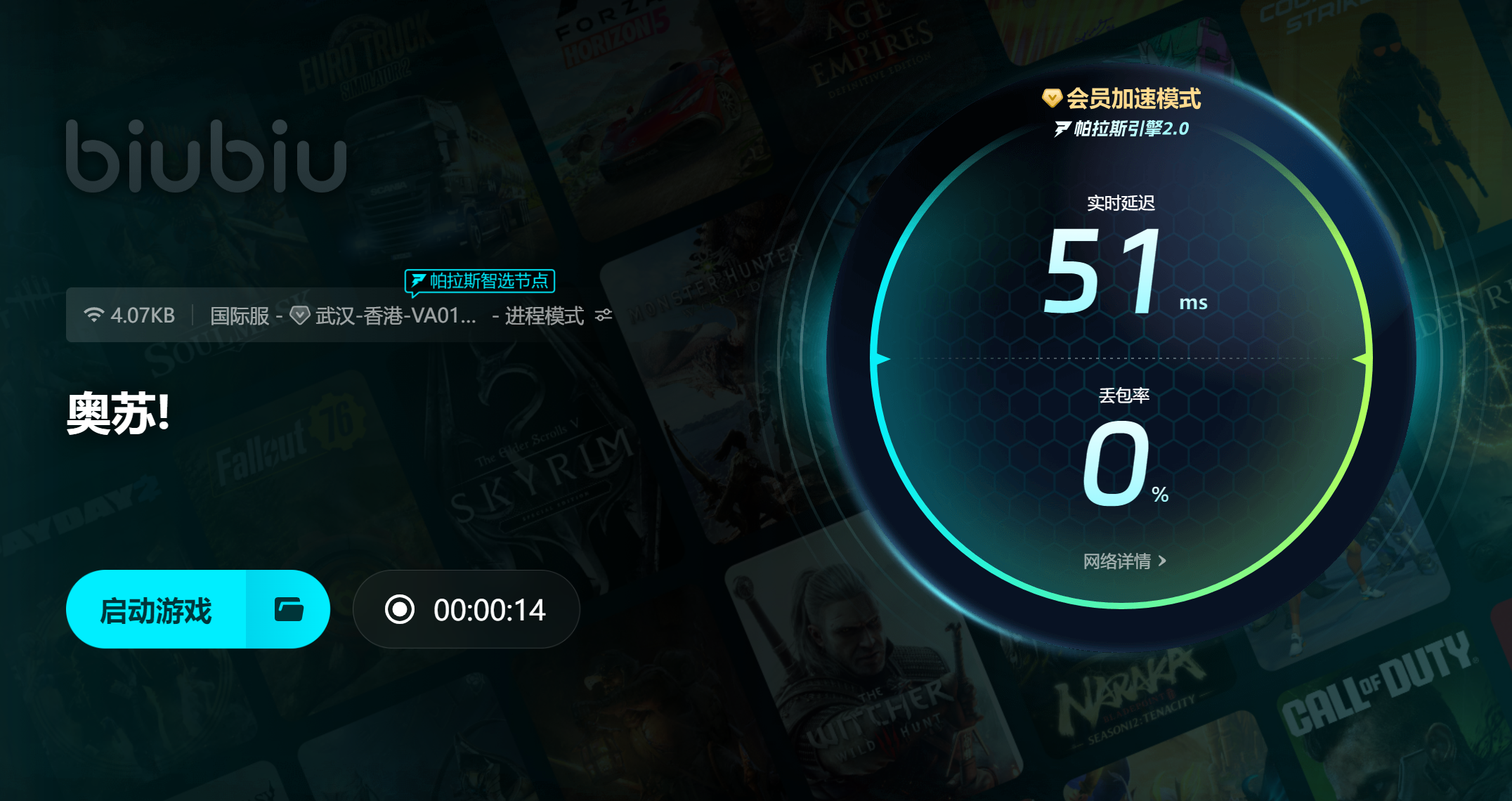 针对《OSU!》这类对延迟敏感的游戏,biubiu独有的WIFI/4G双通道无缝切换技术可实时监测网络波动,在检测到当前线路延迟升高时,自动切换至更稳定的通道,避免因突发卡顿导致的“Miss”判定。biubiu的使用方法简单到不能再简单了,搜索找到对应游戏,即可一键开启加速。