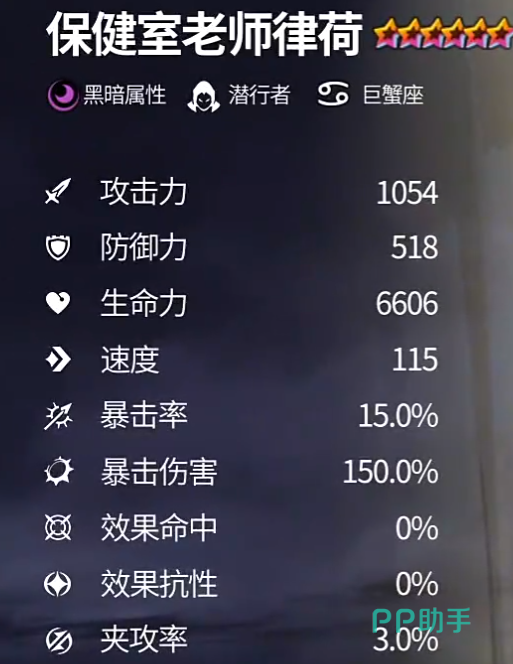 从角色基础档案可知,保健室老师·律荷为暗属性潜行者,星座为巨蟹座。其基础攻击力在同职业中处于中上水平,具备稳定的团队增益与自我保护机制,整体数值设计兼顾功能性与输出潜力。