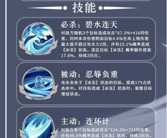 陆逊的控场体系以“冰冻”与“冻结”双层状态为核心,形成阶梯式压制链。其必杀技【碧水连天】是团队级控场枢纽:对敌方三名随机目标造成伤害,并附加基于目标最大生命值的额外伤害;最关键的是,该技能自带基础冰冻概率,且当指定某一目标时,对该目标的冰冻触发率显著提升,并可持续两回合。这意味着单次释放即可稳定限制两名敌方单位,使其连续两回合无法行动、无法释放技能,彻底打乱敌方技能轮次与衔接节奏。尤其在对抗依赖多段连招或高频技能释放的阵容时,群体冰冻能有效削减团队整体承伤压力,提升我方容错率。