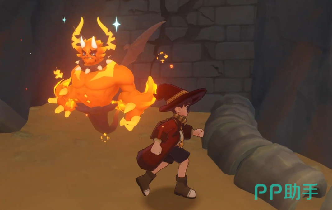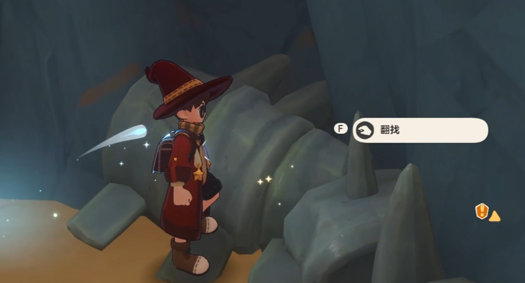 沿着新开辟的道路前进,途中会出现一个小星星道具,记得拾取它。之后返回原点,用精灵打破第二面石墙。墙后隐藏着一个宝箱,打开后别忘了检查周围地面是否有可交互的区域。继续深入山洞,清理掉所有可互动的物品,再折返至紫色大锅的右侧区域,此处同样设有两道石墙等待破解。