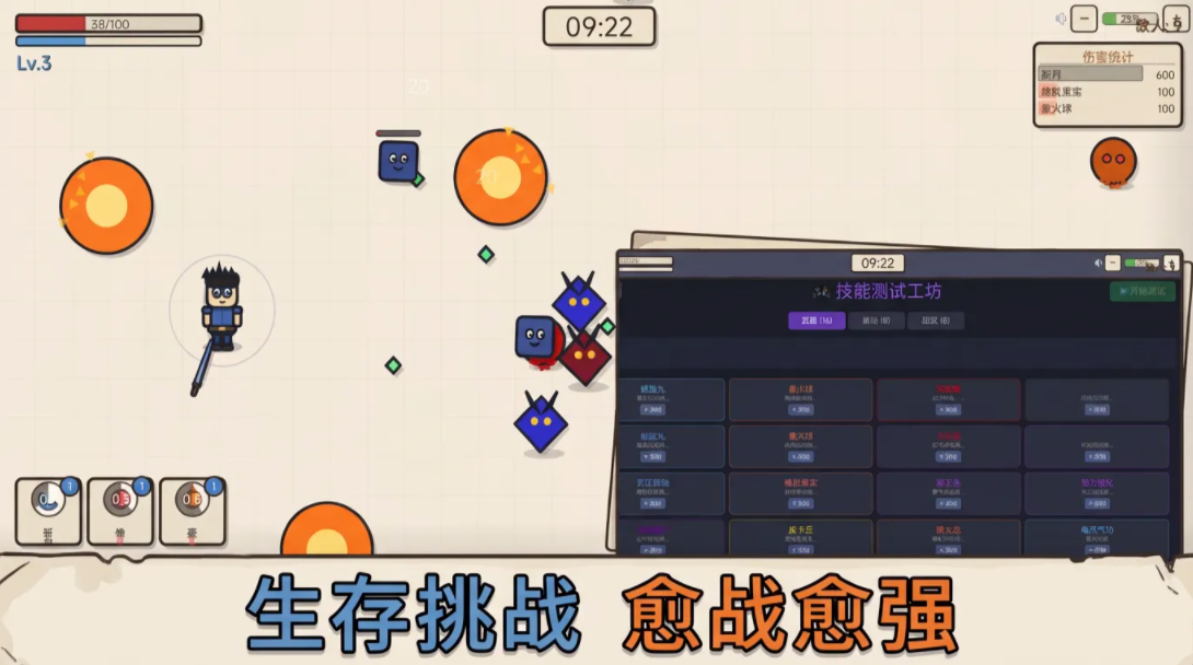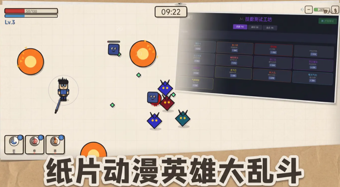 进入游戏后,场景呈现为动态演化的纸面世界——背景随关卡推进产生褶皱、撕裂与晕染效果,而敌人均为抽象化几何体:红三角代表高攻速单位,蓝圆球具备护盾机制,黄方块则拥有群体干扰能力。玩家需依据敌方颜色标识与血条状态,即时切换攻击逻辑。每次成功击败怪物,均会掉落随机技能图标,拾取后可即时装配至技能栏,形成即战力反馈闭环。