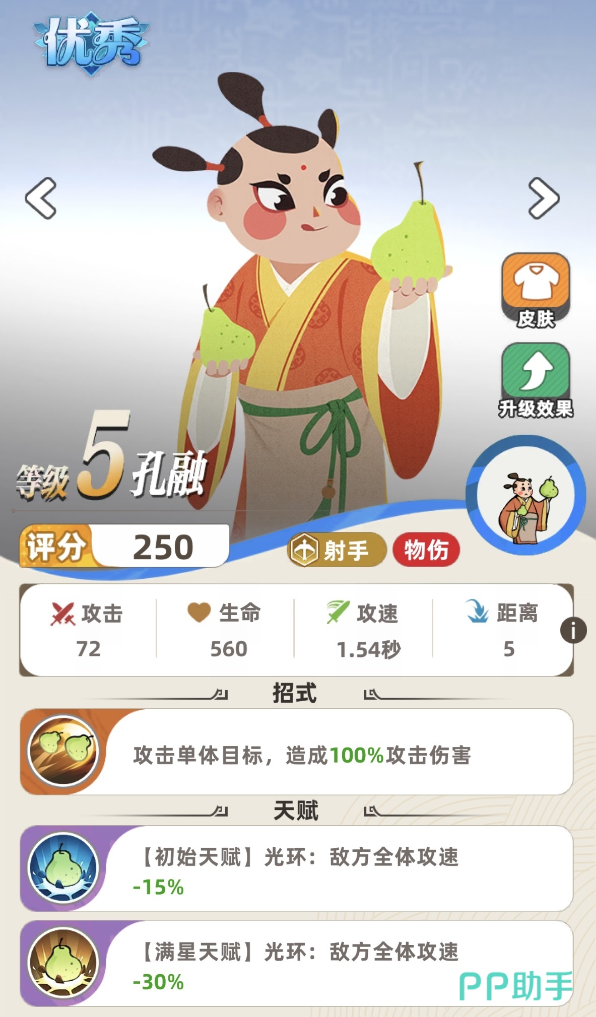 职业定位为射手,核心机制为全体光环型减速——满星满级状态下,可降低敌方全体单位35%攻击速度。该效果不依赖技能释放时机,全程常驻生效,对高攻速体系形成天然压制。当前主流环境中的刺客流(如兰陵王)、爆发射手流(如后羿、李元芳)高度依赖攻速叠加实现秒杀,孔融恰好构成其关键反制手段,是前期推图、特定BOSS战及PVP对抗中极具战略意义的功能型角色。