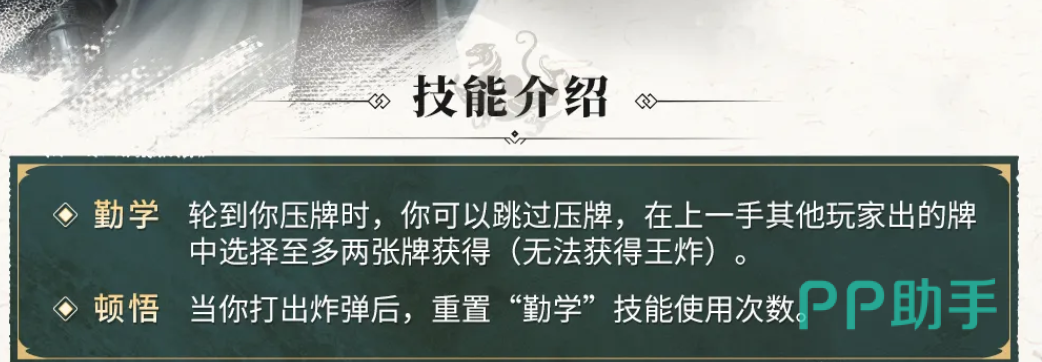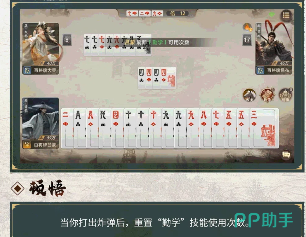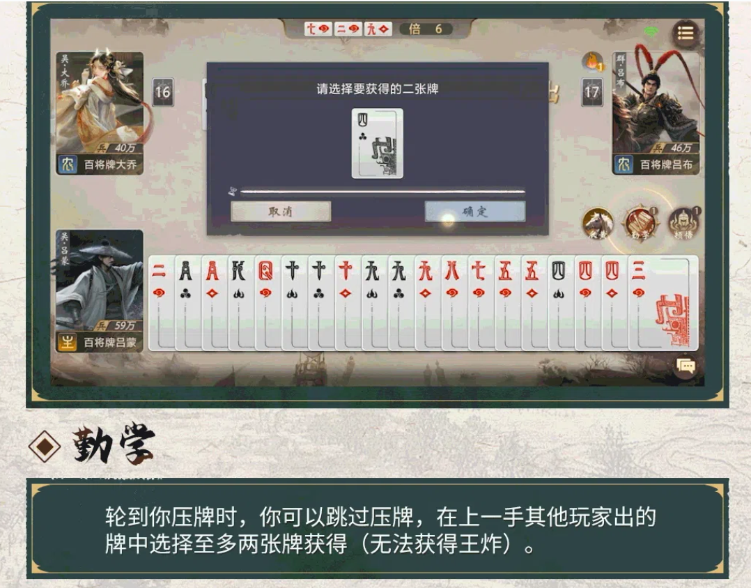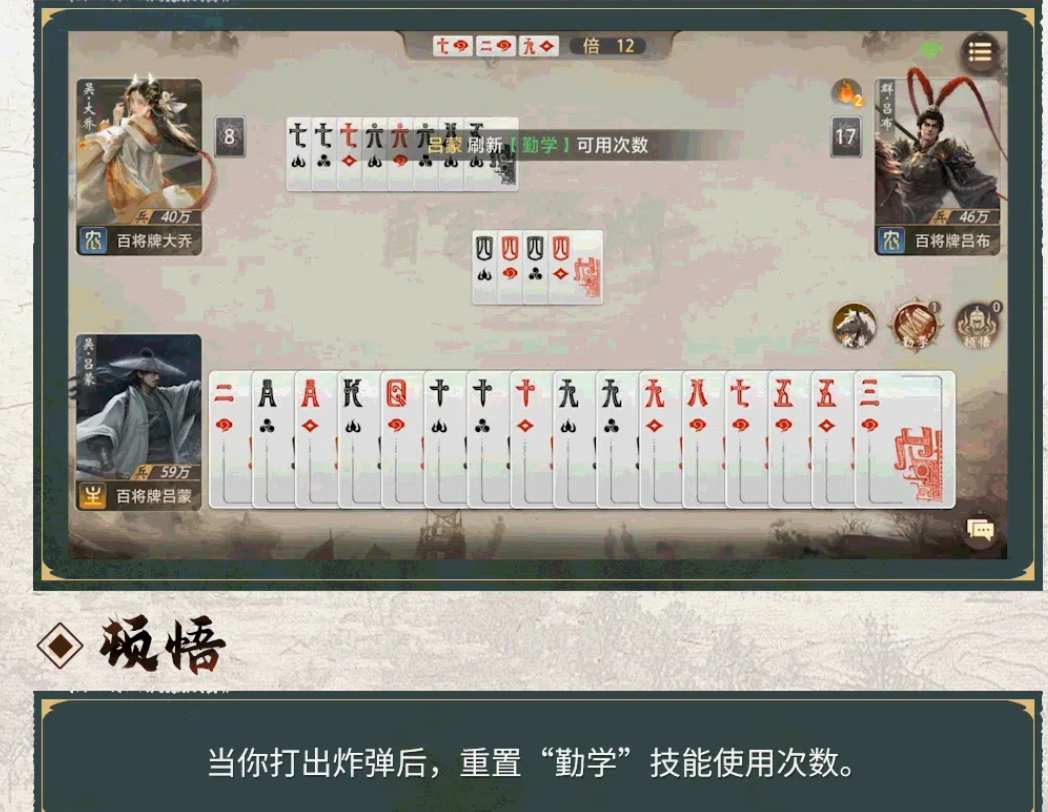 【勤学】是吕蒙的核心补牌技能:当轮到吕蒙出牌时,可选择跳过常规出牌阶段,转而从上一位玩家打出的牌型中,择取至多两张牌加入手牌(王炸不可获取)。该机制要求玩家具备极强的预判能力——需提前判断对手可能出的组合,并预留对应空位,为后续构建炸弹或关键顺子打下基础。实战中,起手无炸切忌抢攻,应以小对子、单顺或连对等低威胁牌型试探,既控节奏又诱使对手暴露牌面,从而提升【勤学】获取目标牌的成功率。