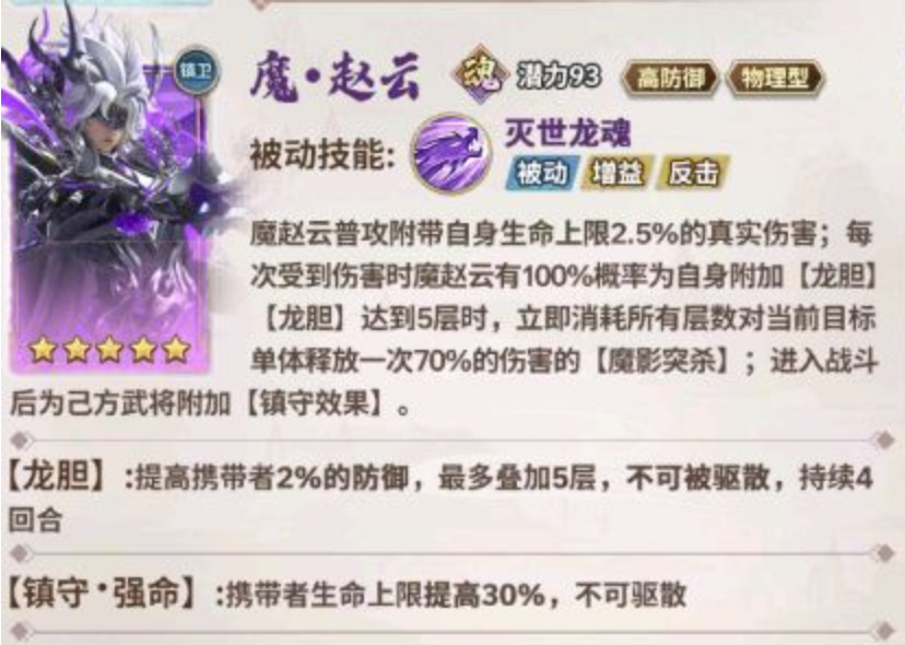 该阵容以赵云与魔·赵云为双核心前排,二者均具备高基础防御、可观生命成长及专属反击技能,获取途径便捷,前期即可满星培养。布阵时必须将其置于第一、二号位——前排高承伤位置不仅能最大化触发反击频率,还能利用敌方普攻与技能的稳定输出节奏,将对方伤害持续转化为我方有效输出。即使面对属性占优的对手,凭借高频次、高倍率的反伤反馈,也能实现战局逆转,体现“以守为攻、借力打力”的战术内核。