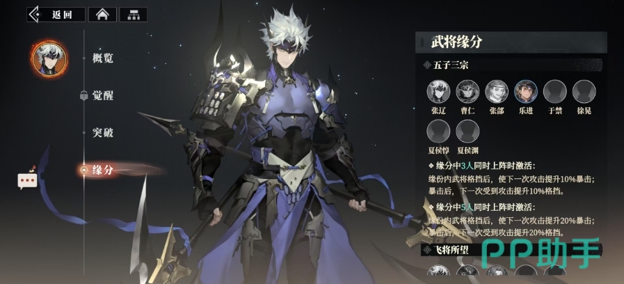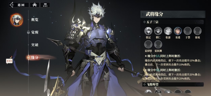 游戏中还存在着需要5名武将同时上阵才能激活的大型阵法缘分,以经典的五子三宗缘分为例,其中涉及到张辽、曹仁、张郃、乐进、于禁、徐晃、夏侯惇、夏侯渊等一众名将,在这个缘分组合中部分武将头像呈现灰暗状态且仅有名字显示,这意味着该武将尚未在游戏中实装,当满足这一缘分条件时,便能够激活独特的效果,比如在该缘分体系下,武将格挡后下次攻击将提升暴击几率,而暴击后下次受击则会增加格挡概率,这种连锁反应式的增益效果。