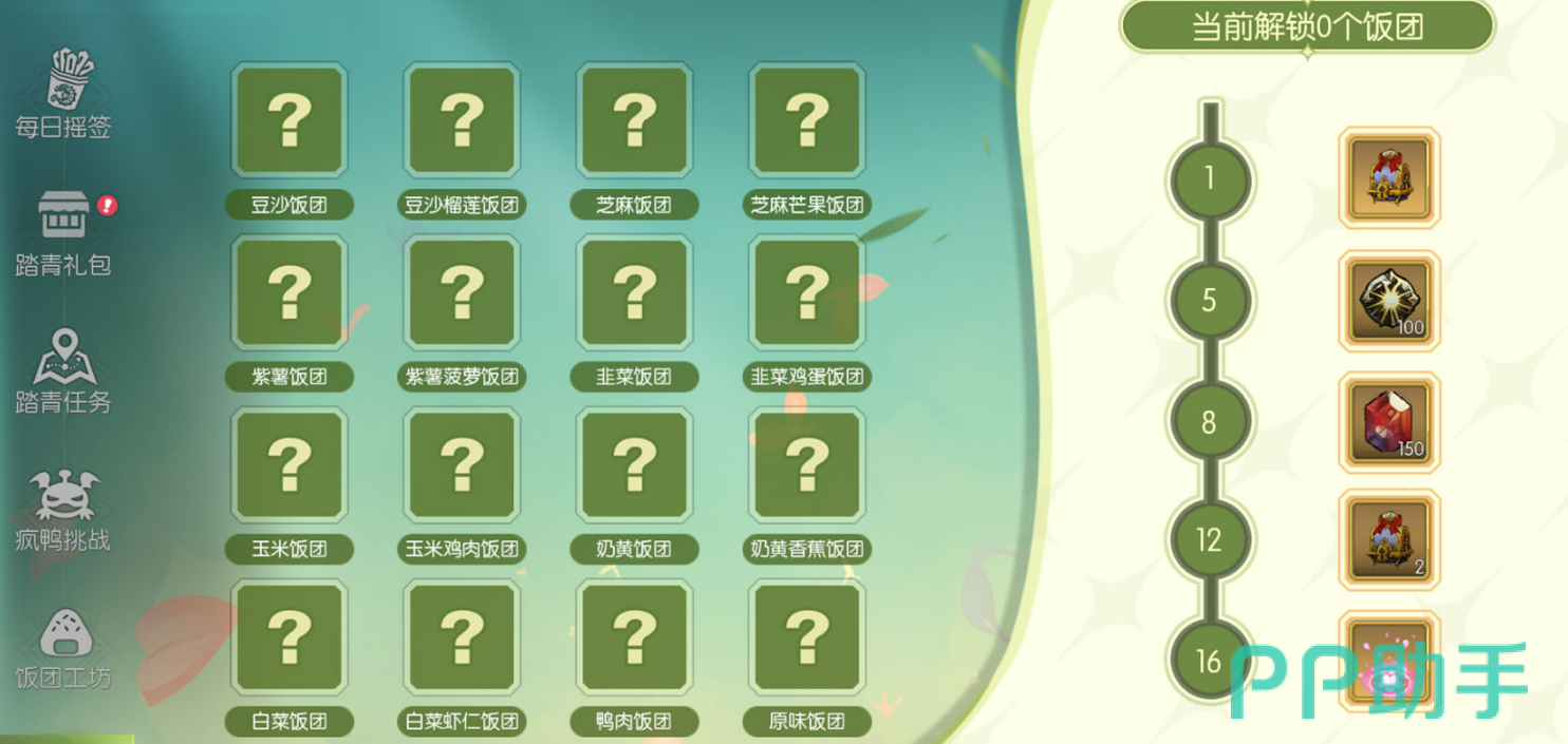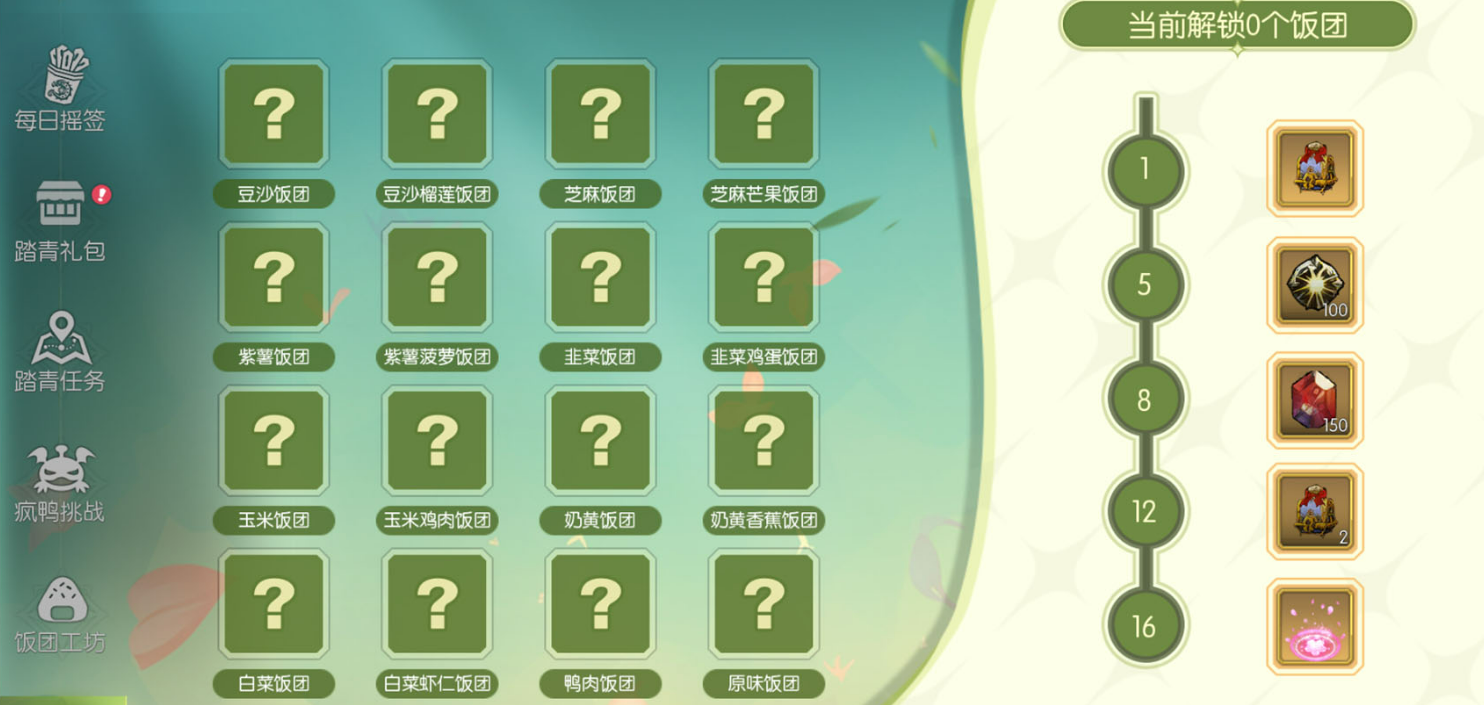然后就是本次活动的主打——“饭团工坊”。这里可以将自己获得的材料放入其中,加入必要的原料,比如大米和白砂糖,然后你就可以开始尝试制作各种饭团啦。总共有16种不同的饭团等你来解锁,每次成功制作出一种新的饭团,都会获得图鉴奖励。如果你能解锁全部的饭团图鉴,还能收获额外的资源奖励哦!每个配方的解锁都让人充满惊喜,挑战隐藏的饭团配方。