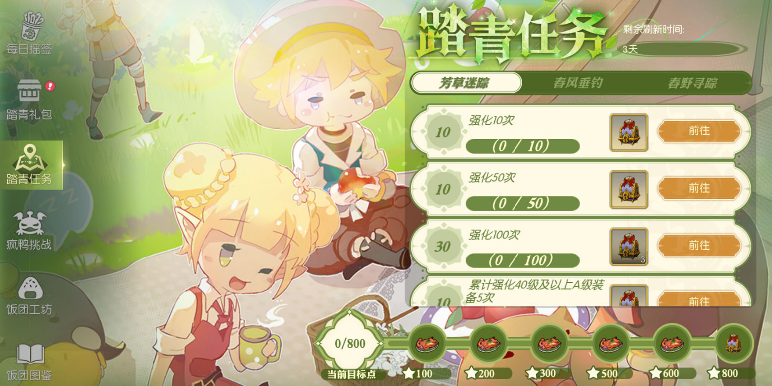 接下来的“踏青任务”是活动的核心之一。每天都有全新的任务等待着大家,任务内容轻松简单,只要按照指示去完成,就能轻松获得饭团制作材料和其他丰富奖励。这种任务不仅能让你在轻松愉快中获得奖励,还能在不知不觉中提高游戏的活跃度。