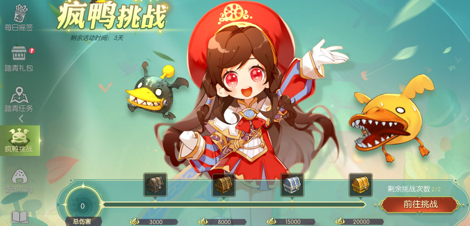 当然,活动中最不容错过的,还是“疯鸭挑战”副本。这个副本每天都能挑战两次,通过不断的战斗和挑战,你能够积累积分,达到一定的分数目标,就能领取到丰厚的奖励。