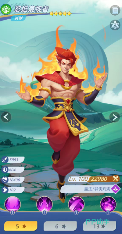 为强化灼烧覆盖率与元素协同,建议搭配火系法师怒焰蔑视者(炎狱)。其技能可对敌方前中排单位造成156%魔法伤害,并附带30%概率施加【灼烧】;更值得注意的是,其普攻同样保有30%灼烧附加率。这意味着在尚绮提供物理群伤灼烧的基础上,炎狱能同步补充魔法路径的灼烧层数,显著缩短5层灼烧的成型周期,大幅提升全队DOT(持续伤害)的启动速度与压制强度。
