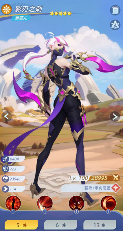 若追求更高频次的斩杀能力,可选用影刃之刺蕾蕊儿作为罗兰的战术替代或功能补强。其核心机制为【审判】:锁定敌方生命值最低单位,造成298%伤害+90%攻击力的真实伤害,并附加“受伤害提高20%、防御力降低20%”的减益;若成功击杀,则自动对新生命最低目标追加一次50%原伤害的额外攻击(整场战斗限触发1次)。此外,其普攻恒定对生命最低目标造成120%伤害,使其天然契合灼烧队“压低血线→触发审判”的作战闭环,定位更偏向终结者。