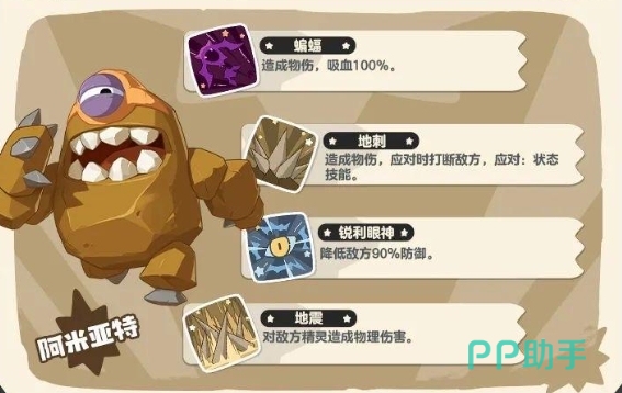 阿米亚特在初级阶段便掌握了扬沙技能,能够对敌方精灵造成物理伤害。虽然伤害值不高,但在战斗初期,扬沙可以为阿米亚特积累优势,为后续的技能释放奠定基础。