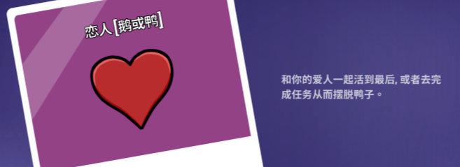 恋人的组合形式多样,可能是两只鹅,也可能是一鹅一鸭,前者需要协作完成任务,后者则需保护另外一方,因为一旦其中一方遭遇不幸,另一方也会被淘汰,如果一方被鹈鹕吞噬,另一方不会马上死亡,但在召开会议时会直接毙命,只有活到最后并将剩下的狼或鹈鹕投票出局,才能共同胜利。