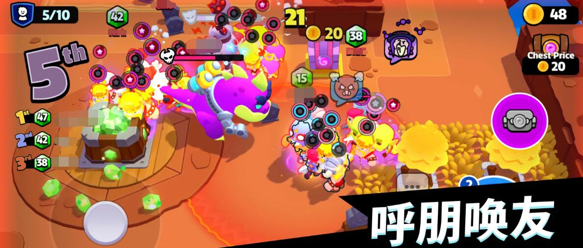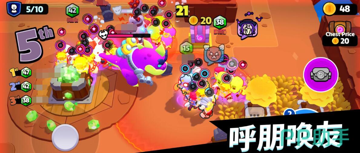 游戏核心玩法还是围绕宝石争夺玩法,单局时长约4分钟。10名玩家同场竞技,前期通过击败野怪、开启宝箱获取金币,而人物方面招募新角色扩充队伍,凑齐3名相同角色可合成强化形态。传统模式对战的话都是中央定时刷新的宝石矿井触发最终混战,玩家需在缩圈机制下平衡发育与对抗,最终以宝石数量决定胜负。而且还有数十种随机玩法例如追击哥布林、触发幽灵助战等,休闲体验十分丰富。