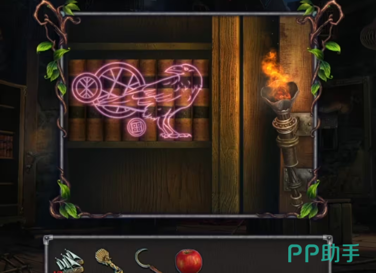 接下来玩家会解锁一个马车图案场景,解谜是比较简单的,观察图案发光的位置进行解谜。玩家先检查一下马车车轮的位置然后再使用上一个场景获得的雕像来得到马车的车轴,然后对着图腾使用刚刚获得到的车轴,会得到火把道具。成功打开门之后,玩家将宝石安装在刚刚获得的箱子上就会得到苹果和马鞍这两个道具,获得这两个道具之后家再次回到刚刚那个马车图案的场景对马嗯,使用皮带来触发骑马的剧情,就可以骑着马到到新的港口。