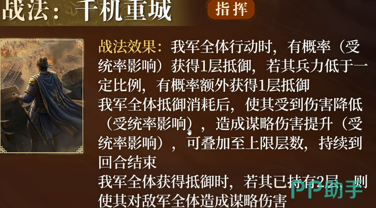其自带战法【千机重城】为指挥型战法,机制兼具功能性与爆发潜力。该战法可使己方全体在行动时概率获得“抵御”状态;当武将兵力低于50%时,触发额外一层抵御获取机会。每层抵御不仅降低所受伤害,还同步提升自身谋略伤害输出,效果可叠加,持续至当回合结束。更关键的是——任意我方武将叠满2层抵御时,将立即对敌军全体发动一次谋略伤害。这一设计实现了“减伤—增伤—范围反打”的三重闭环,显著强化前排生存与团队压制能力。