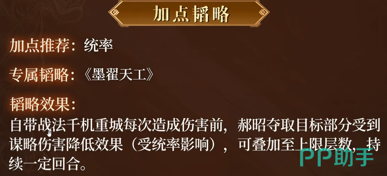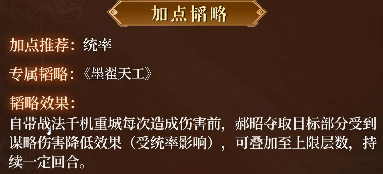 属性加点方面,强烈建议主升【统率】。原因在于:千机重城的抵御触发概率、减伤比例、谋略增伤幅度三项核心数值,全部与统率属性直接挂钩。统率越高,战法稳定性与上限越突出,无需考虑其他属性路线,资源集中投入即可最大化收益。